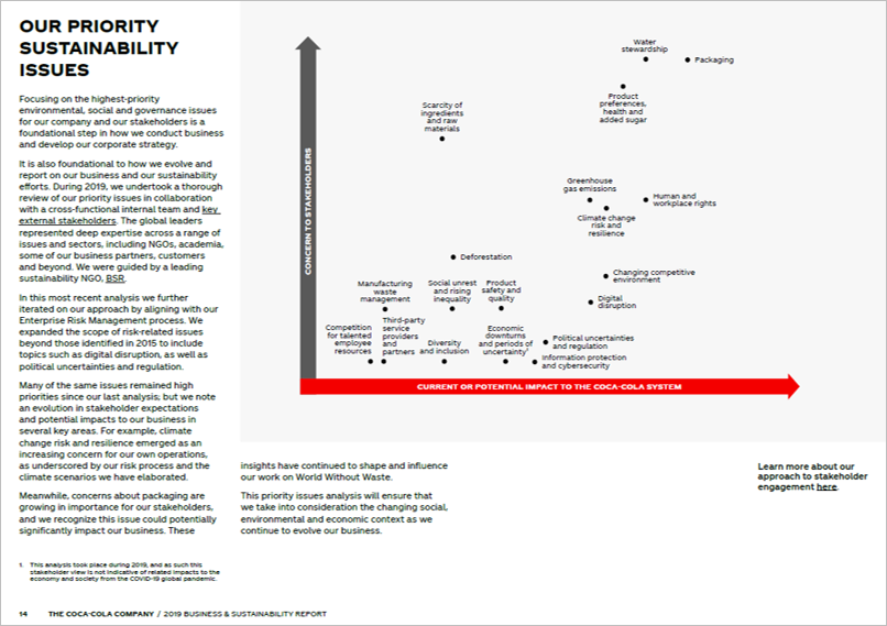 코카콜라 지속가능보고서의 중요성 평가 내용을 요약하면 다음과 같습니다.