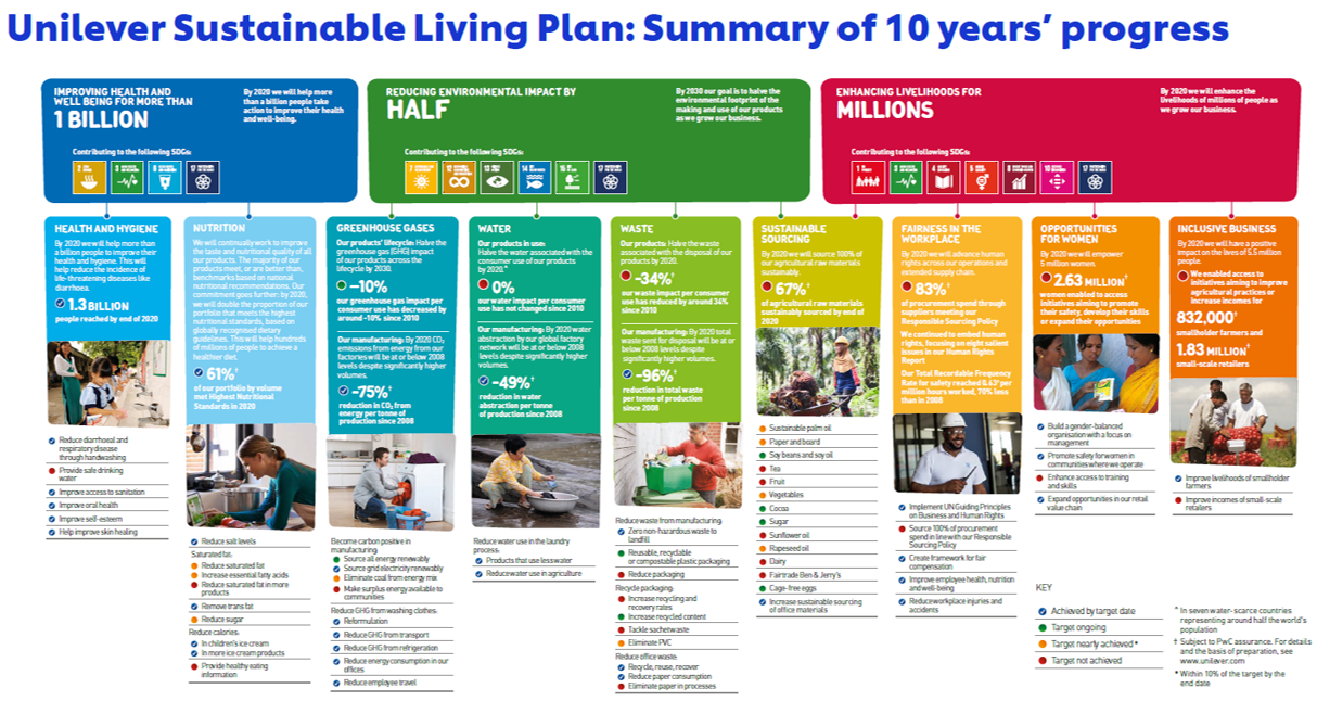 예를 들어, 유니레버는 2010년 USLP를 발표하면서 2020년까지 자사의 모든 비즈니스 가치사슬에서 환경영향을 절반으로 줄이겠다는 매우 당찬 목표를 제시했다. 그리고, 매년 그 성과를 숫자로 공개했다. 10년이 지난 후 잘된 것도 있지만 목표를 달성하지 못한 것들도 있다.