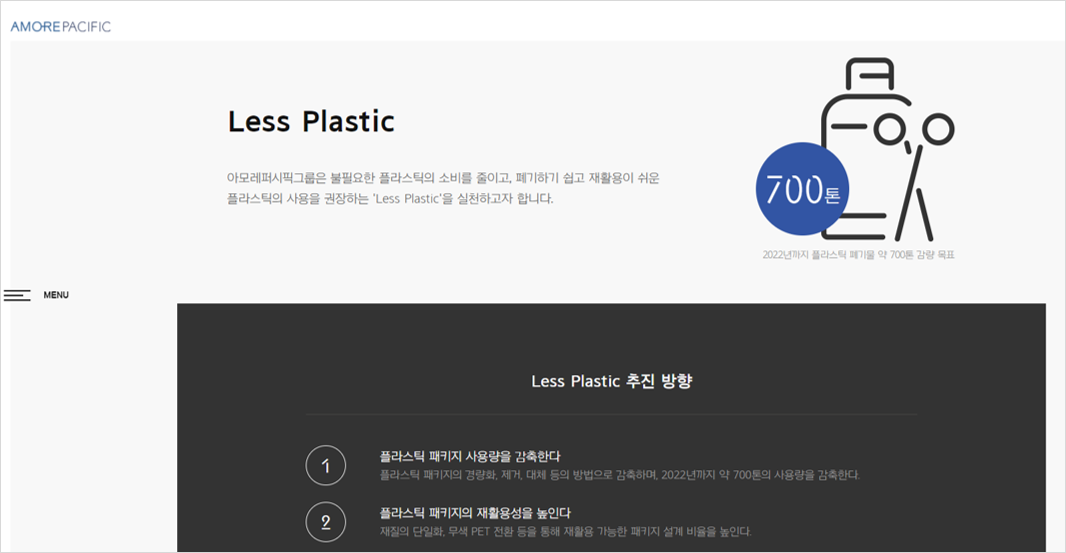 외국 기업만 잘하고 있는 것은 아니다. 홈페이지에 지속가능보고서 마이크로 사이트를 운영하고 있는 아모레퍼시픽은 한눈에 직관적으로 숫자를 확인하기는 어렵지만, 2022년까지 700톤의 플라스틱을 줄이겠다는 구체적인 숫자를 목표로 제시하고 있다.
