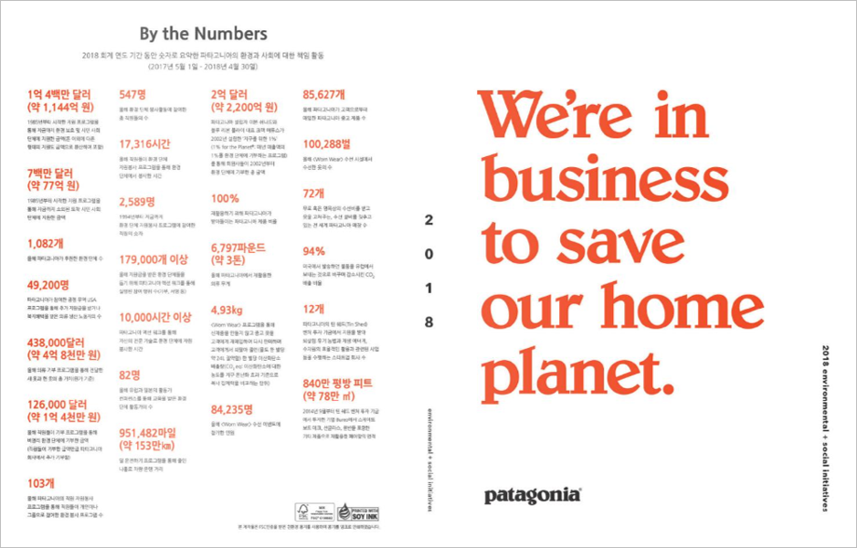 비상장 기업이지만, 꾸준히 환경보고서를 발간하고 있는 파타고니아의 경우도 숫자로된 데이터를 공개하고 있다. 2019년에 발간된 2018년 파타고니아 환경보고서를 보면, 미국에서 발송하던 제품을 유럽 현지 공장에서 배송하는 시스템으로 변경하여 기존대비 94%의 CO2 배출을 줄였으며, 공정무역인증 지원프로그램을 통해 추가급여 또는 지원금을 받은 협력업체의 직원 수가 49,200명이라는 정보를 공개하고 있다.
