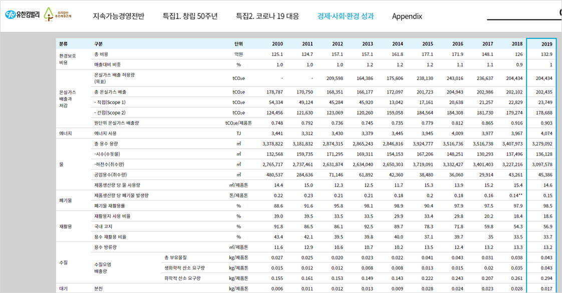 2010년부터 지속가능보고서를 발간해온 유한킴벌리는 홈페이지와 지속가능보고서에 경제, 사회, 환경성과를 숫자로 공개하고 있다. 공개된 숫자들을 보면 급격하게는 아니지만 꾸준하게 사회, 환경성과를 높이고 있는 것을 볼 수 있다. 이 영역을 잘아는 사람이 아니면 제시된 숫자가 무엇을 의미하는지 잘 모를 수 있다는 점을 앞으로 보완하면 참 좋겠다는 생각을 해본다.