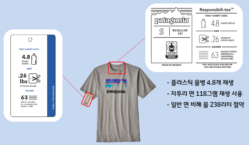 파타고니아는 제품과 제품라벨에도 ESG 정보를 공개하고 있다. 위에 보이는 T셔츠는 4.8개의 PET병을 재활용한 섬유 50%와 0.26 파운드의 재활용 면조각 50%를 혼합해서 만들었으며, 제조과정에서 기존 제품대비 63갤론의 물을 절약했다는 정보가 제품 안쪽과 라벨에 인쇄되어 있다.
