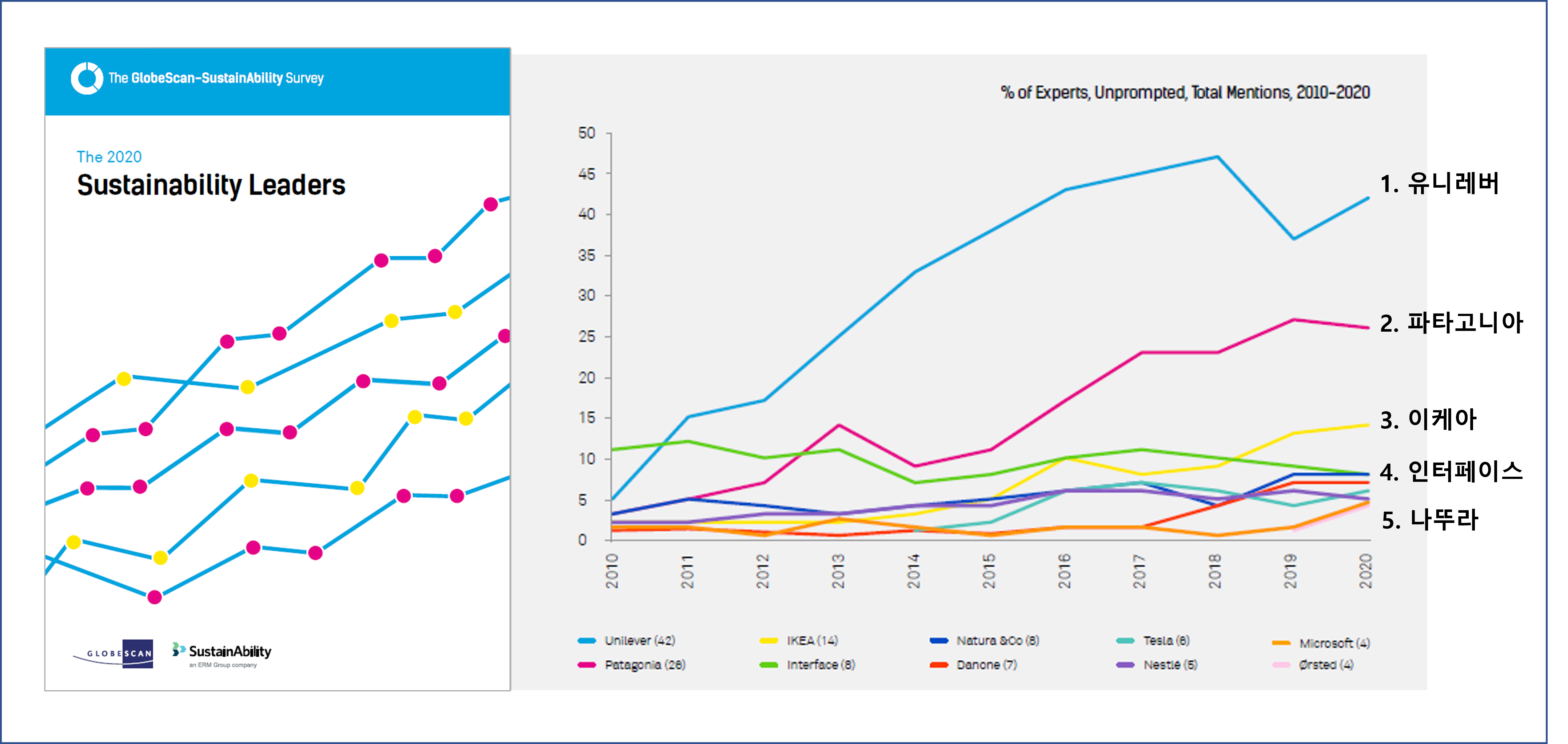 지속가능(ESG)경영 영역에서 가장 신뢰도 높은 서베이 중 하나인 The GlobeScan-SustainAbiliy Survey(이하 GSS)에 의하면 2020년 기준 세계에서 지속가능경영을 가장 잘하는 기업의 순서는 "1위 : 유니레버, 2위 : 파타고니아, 3위 : 이케아, 4위 : 인터페이스, 5위 : 나뚜라"이다.
