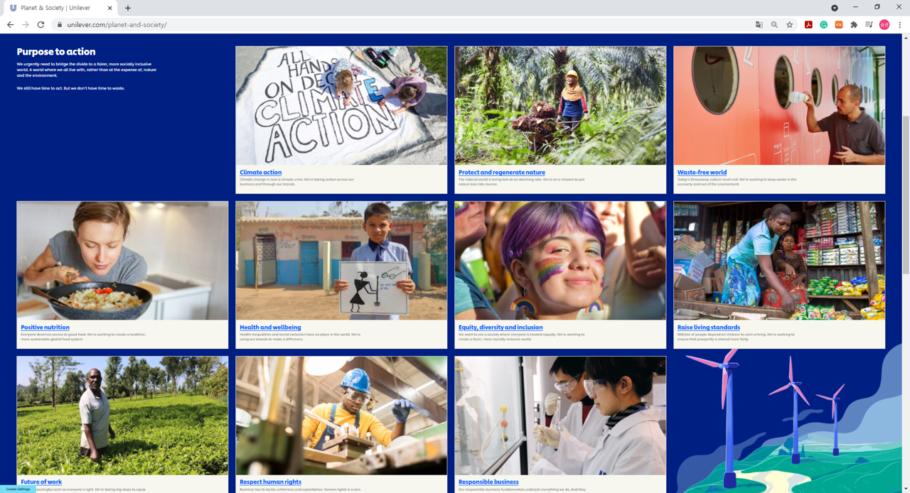 유니레버 글로벌 홈페이지에 접속하면 상단 메뉴에 "지구&사회(Planet & Society)" 메뉴가 보인다. 이 메뉴를 클릭하면 유니레버의 광대한 지속가능경영 세계(우주)가 펼쳐진다. 기후변화 대응, 자연생태계 보호, 폐기물 제로, 긍정적인 영양, 건강과 웰빙, 평등/다양성/포용성, 삶의 기준 높이기, 미래의 일, 인권존중, 책임있는 비즈니스, 지속가능성 리포트 센터 등 유니레버의 지속가능경영 비전인 USLP(Unilever Sustainable living Plan)의 핵심 주제별로 각각의 마이크로 사이트를 구축하고 있다.