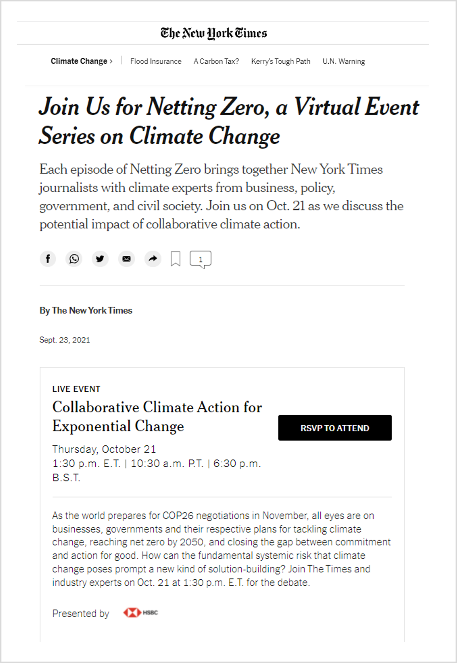 그런 뉴욕타임즈가 기후변화(Climate Change)를 다룬 특별 페이지를 운용하고 있다. 또, Climate Hub 라고 하는 온라인 이벤트도 준비하고 있다. 무제한 기사보기는 유료로 운영하고 있지만 매달 커피 한 잔도 안되는 값으로 세계 최고의 전문성을 가진 기자의 글을 읽어볼 수 있다는 것은 참 다행스러운 일이다.