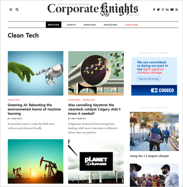 캐나다의 언론사인 Corporate Knights는 지속가능경영, CSR, ESG 투자를 전문적으로 다루는 매체이다. 매년 지속가능한 기업의 랭킹을 매기기도 하는 이 언론사는 환경경영, 크린테크, 환경위기, 지속가능한 투자, 교육 불평등 해소, 신재생 에너지, 지속가능한 식생활, 폐기물 재활용, 지속가능한 소비 등 지속가능한 시장형성과 기업경영을 위한 다양한 영역의 전문기사와 함께 통계자료도 내놓고 있다.
