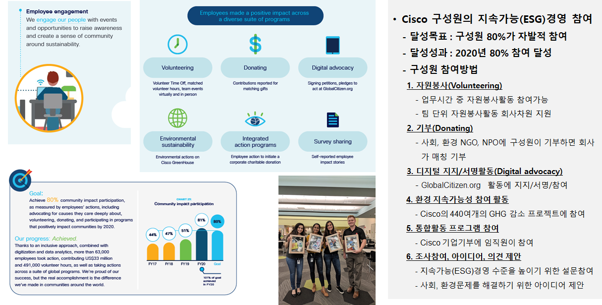 기후변화에 대응하는 시스코의 일곱번째 활동은 임직원의 참여입니다. 시스코 임직원의 참여는 자원봉사, 기부, 서명활동, 아이디어 제안 등입니다. 임직원의 적극적인 참여 없이 지속가능(ESG)경영을 제대로 실행하는 것은 불가능한 일입니다. 시스코는 직원들이 제안한 에너지 절감, 순환비즈니스 아이디어를 적극적으로 받아들여 실천하고 있는 것으로 보입니다.