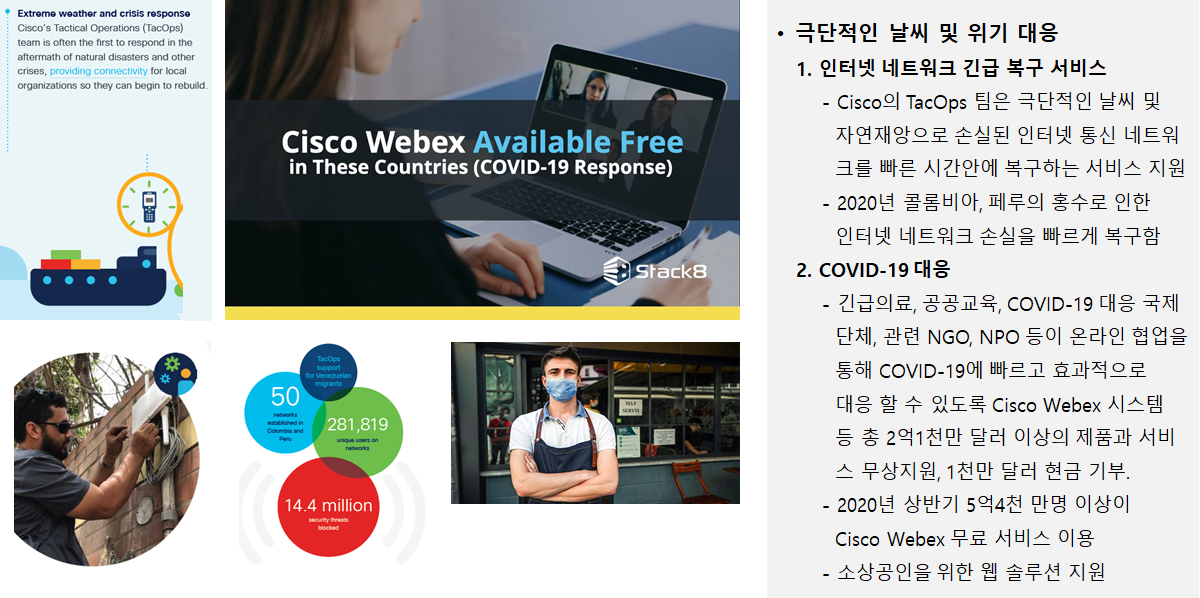 시스코의 여덟번째 기후변과 대응활동은 극단적인 날씨 및 위기 대응입니다. 기후변화로 인해 태풍, 홍수, 가뭄과 같은 자연재해가 예상하지 못할 정도로 많이 늘어나고 있습니다. 시스코는 예상치 못한 갑작스런 자연재해로 인해 인터넷 통신 네트워크가 손실된 지역에 긴급 복구팀을 파견하여 빠른 시간안에 인터넷 통신이 가능하도록 하는 지원체계를 갖추고 있습니다. 그리고 코로나 19와 관련하여 2020년 한해동안 웹엑스 시스템 등 총2억1천만 달러 이상의 제품과 서비스를 무상지원했습니다. 현금 기부는 1천만 달러를 했습니다.