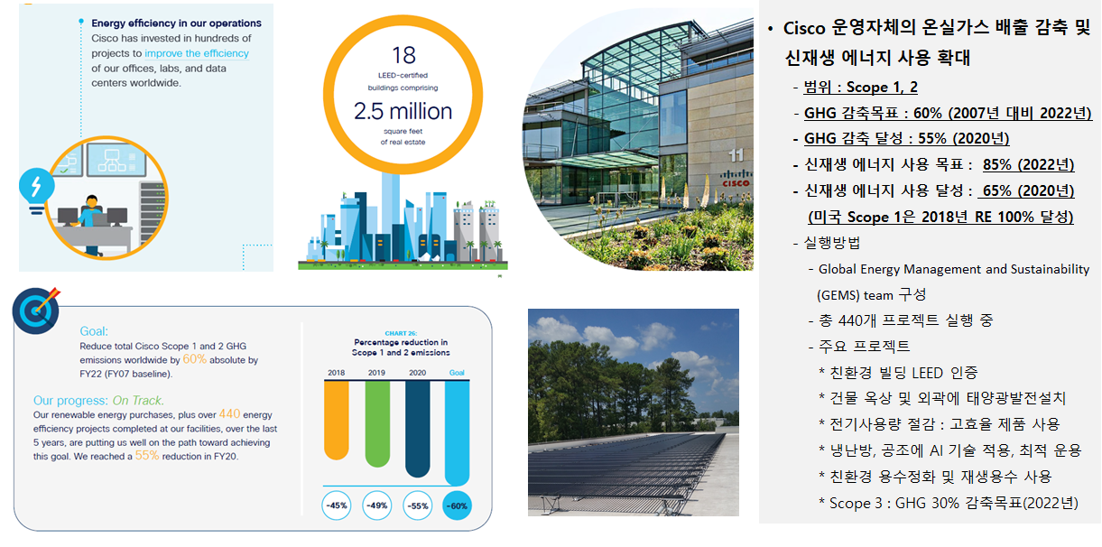 CISCO는 신재생에너지 사용과 관련하여 2022년 RE 85% 달성을 목표로 하고 있습니다. 2017년에는 미국과 인도지사의 RE 50%를 달성했고요. 2020년에는 미국과 유럽일부 지사에 RE 100%을 달성할 수 있는 신재생에너지 구매계약을 완료했습니다. 인도지사도 RE 60% 달성할 수 있는 신재생에너지발전소 건설 투자계약을 체결했다고 합니다.