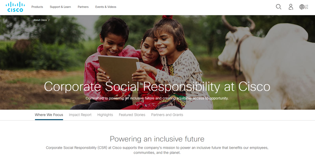 다시 시스코의 사례로 돌아오면, CISCO의 CSR 미션은 “Powering an inclusive future” “포용적인 미래를 위한 지원” 입니다.