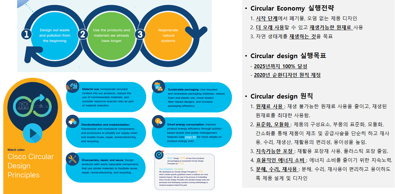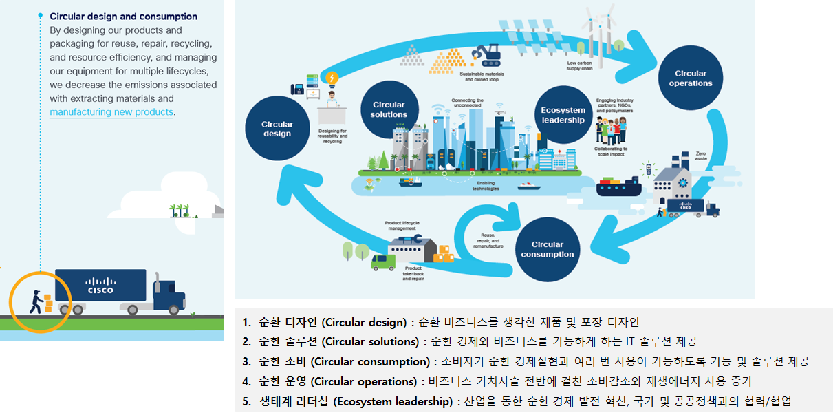 CISCO의 순환비즈니스 모델은 그림과 같이 순환 디자인, 순환 솔루션, 순환 소비, 순환 운영, 순환 비즈니스의 생태계 리더십인데요. 이중에서 특히, 순환 디자인과 순환 소비에 집중하고 있는 것 같습니다.