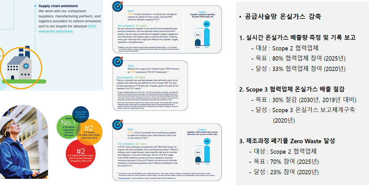 또한 제조과정에서 폐기물 제로화에 협력하는 생산협력업체를 2025년까지 70%이상으로 하겠다고 하는데 2020년에 23%를 달성했다고 합니다. 역시, 아무리 시스코라고 해도 생산협력업체를 지속가능(ESG)경영으로 끌어드리는 것은 쉽지 않아 보입니다.