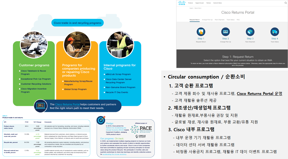 첫번째는 고객 순환 프로그램입니다. 시스코는 홈페이지내에 Cisco Returns portal 이라는 마이크로 사이트를 운영하고 있습니다. 이 사이트는 고객들이 사용이 끝난 시스코의 제품을 택배를 활용해 편리하게 반납할 수 있도록 안내하는 사이트입니다. 제품을 반납한 고객들은 다음 번 시스코 제품구입때 활용할 수 있는 포인트를 지급받습니다.