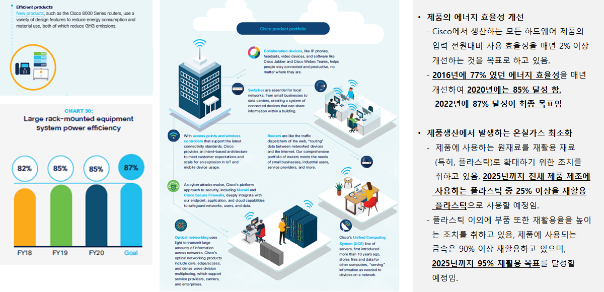 2016년에 시스코가 생산한 IT 장비의 평균 에너지 효율성이 77% 였습니다. 이것을 2022년에는 87%로 올리겠다는 목표를 제시하고 있습니다. 2020년에는 85%를 달성했습니다. 또한 2025년까지 전체 제품에 사용하는 플라스틱 부품 중 25%를 재생 플라스틱으로 하겠다고 합니다. 금속 부품의 경우 2025년까지 95% 재활용율을 목표로 제시하고 있습니다.
