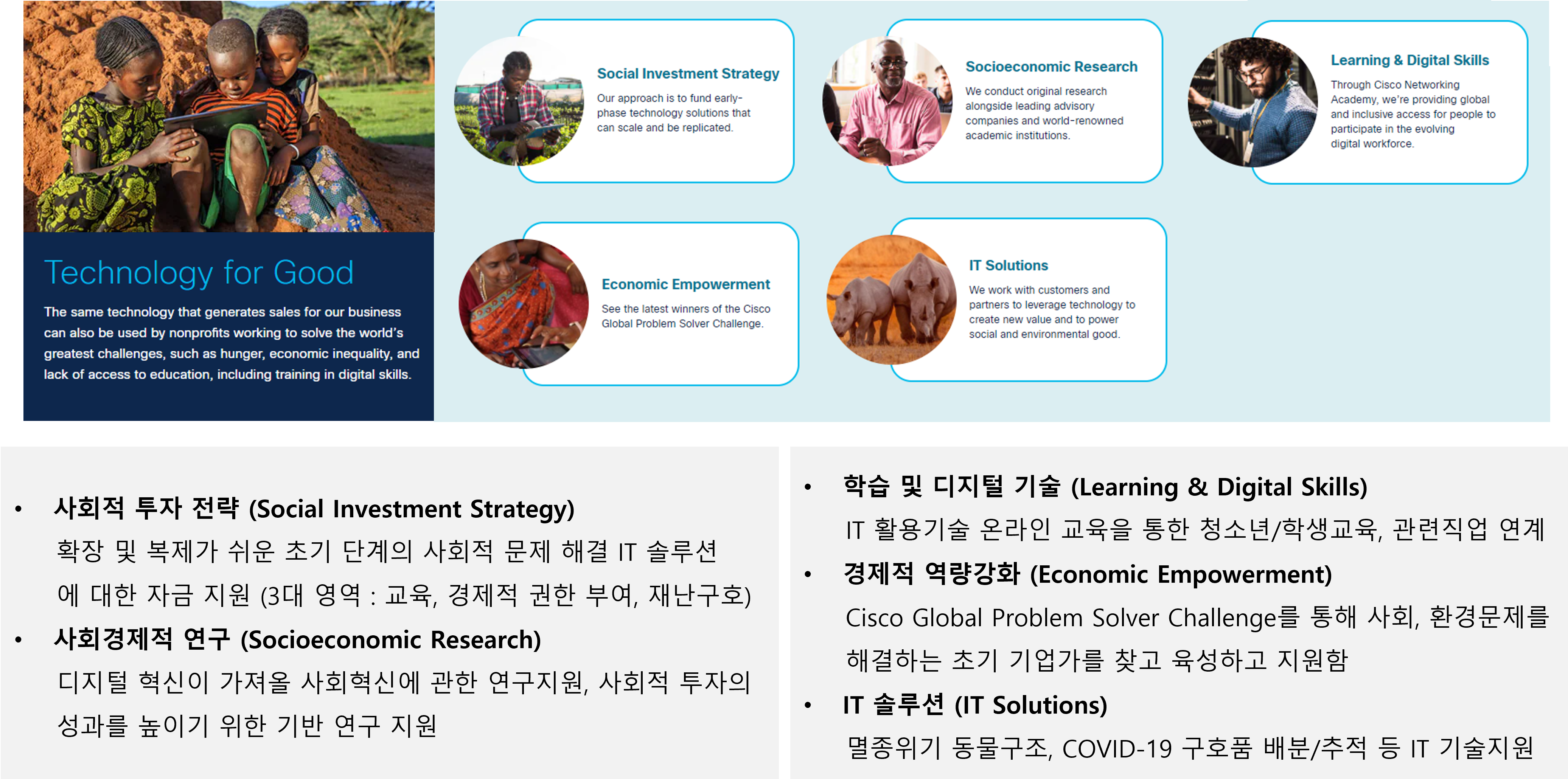 누가보더라도 이해하기 쉽게 그려 놓았습니다. 이런 방식의 그림은 우리나라 기업들도 충분히 따라하면 좋겠다 하는 생각이 듭니다. 아무래도 CISCO가 IT 솔루션을 제공하는 회사이다 보니 비즈니스에서도 이렇게 전체적인 관점의 접근이 익숙한 것 같고, CSR, 지속가능(ESG)경영도 이렇게 큰 그림을 그려서 설명하고 있는 것 같습니다.