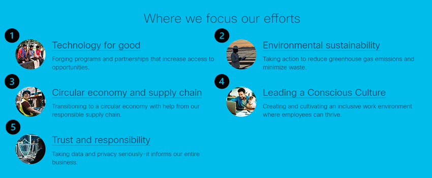 CISCO CSR의 초점은 5가지 영역에 집중되어 있습니다. 첫번째 영역이 선(Good)을 위한 기술, 두번째 영역은 환경적 지속가능성, 세번째 영역이 순환경제 및 공급망, 네번째 영역이 의식적인 문화 선도, 다섯번째 영역이 신뢰와 책임입니다.