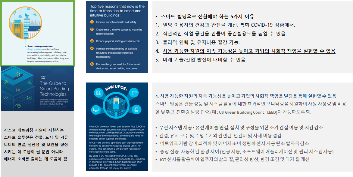 시스코의 기후변화대응 다섯번째 행동은 “스마트 빌딩, 스마트 시티 솔루션 제공”입니다. 시스코는 빌딩과 도시를 운용하는 인터넷 네트워트 시스템 구축이 주 사업분야입니다. 따라서 빌딩내 네트워크를 구축하거나 도시의 네트워크를 구축할 때 기존 유선 중심의 네트워크 대신 시스코의 무선 중심 네트워크를 사용하면 유선 네트워크 구축에 필요한 전선과 통신 케이블 사용을 혁신적으로 절감할 수 있기 때문에 자원절약과 유지보수 측면에서 굉장한 효과가 있다고 합니다.