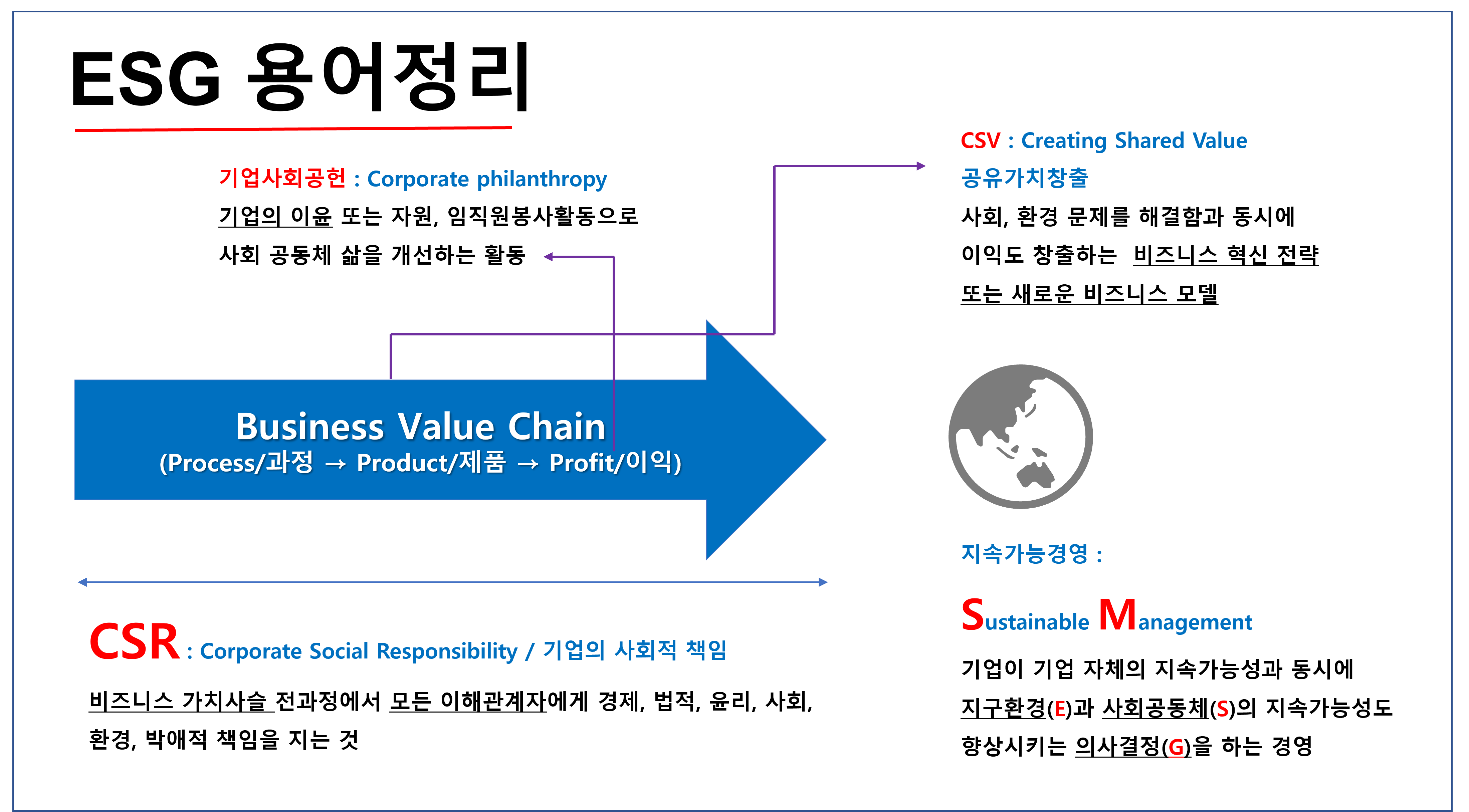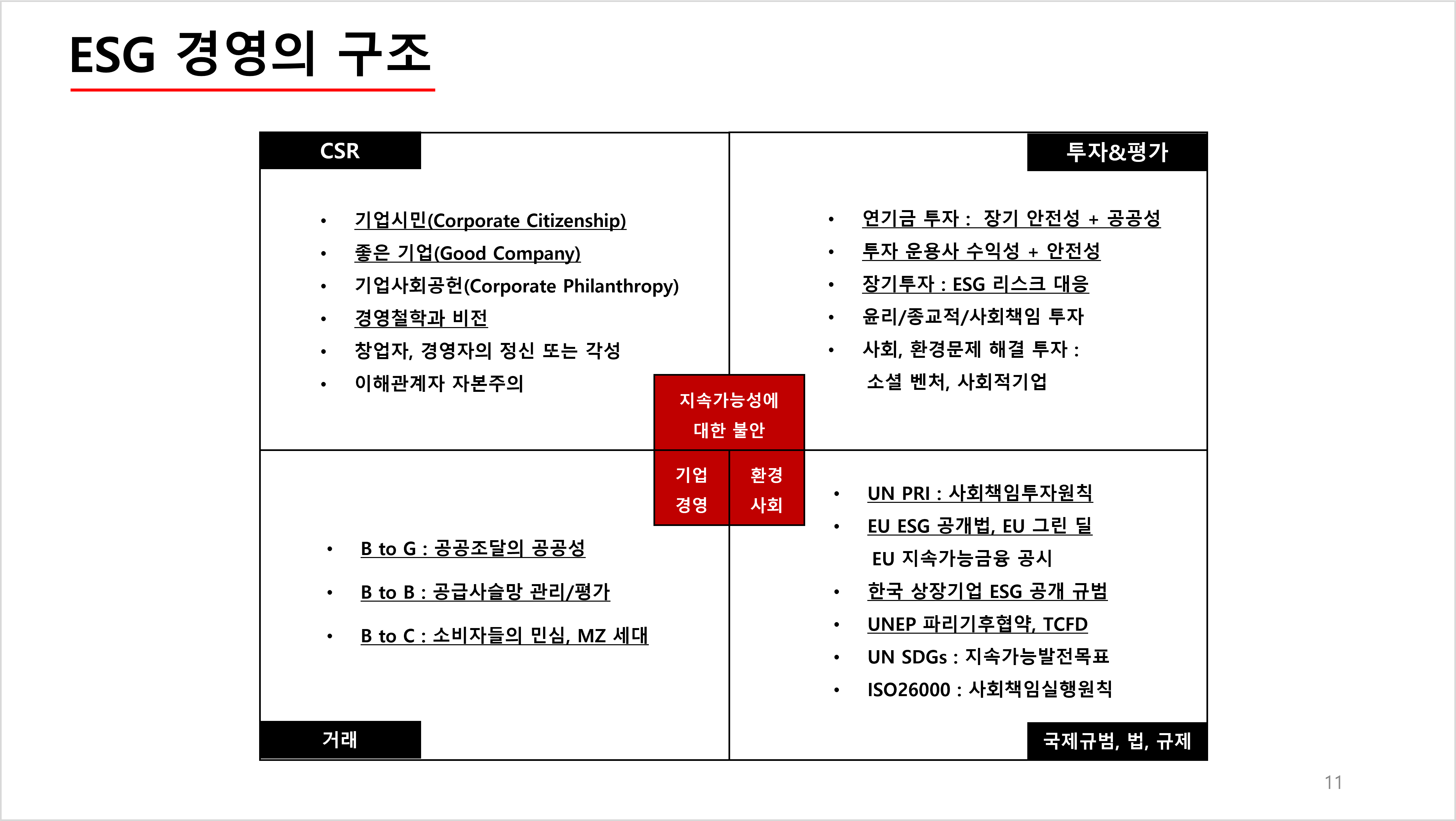 그의 설명대로, 첫 단추를 잘못 끼운 셈이다. 1990년대 들어 한국에 CSR이 들어올 때 이 개념이 기업사회공헌으로 잘못 이해되었고, 2000년대에는 지속가능발전과 지속가능경영이 동전의 뒷면에 해당하는 기업의 실리적 지속가능성으로만 이해되어 자리를 잡았던 탓이다. 이러한 맥락 때문에 한국사회는 ESG가 CSR과 지속가능경영의 다른 측면을 이야기하는 하나의 인물임에도 불구하고 새로운 존재가 나타났다는 듯 혼란을 겪고 있는게 아닐까.
