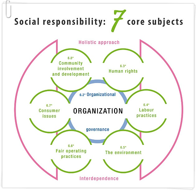 또한 ISO26000은 사회적 책임을 수레바퀴 모양으로 구조화 한 후 일곱 가지 핵심 영역으로 구분하여 제시하였다. 수레바퀴의 가운데 축은 ‘조직과 거버넌스’이고 수레바퀴의 여섯 개 살은 ‘인권, 노동관행, 환경, 공정운영관행, 소비자 이슈, 지역사회 참여와 발전’으로 구성되어 있다. ISO26000의 7대 핵심 영역의 내용과 실행방법은 이후 다시 소개할 것이다.