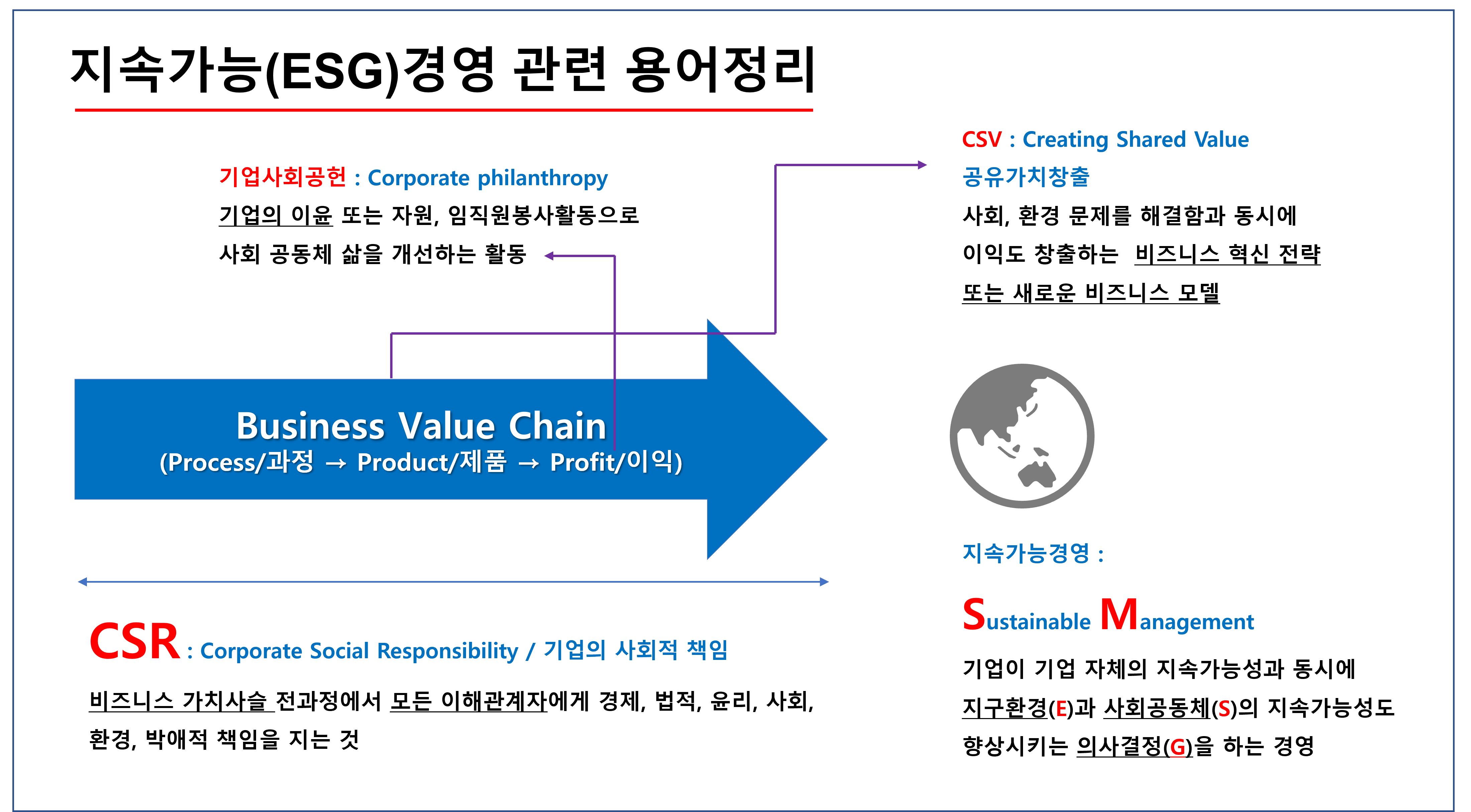 따라서 ESG는 지속가능경영의 범위내에서 사회공헌, CSR, CSV와 통합, 연계되는 관점으로 이해해야한다.