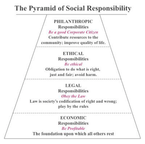 캐롤의 CSR 피라미드에 가장 아랫단에는 경제적(economic)책임이 자리 잡고 있다. 기업의 근본적인 존재 이유가 상품과 서비스의 생산, 고용창출 등 경제적 가치창출에 있다는 것을 강조하고 있는 것이다. 두 번째와 세 번째 단은 각각 법적(legal)책임과 윤리(ethical)책임이 자리를 잡고 있다. 기업이 경제적 가치를 창출하면서 법적인 그리고 사회윤리적인 범위를 벗어나면 안된다는 것을 의미한다. 그리고 가장 윗단에는 박애적(philanthropic)책임이 있다. 기업이 가진 자원을 가지고 지역 공동체의 삶을 개선하는데 노력해야 한다는 것이다.