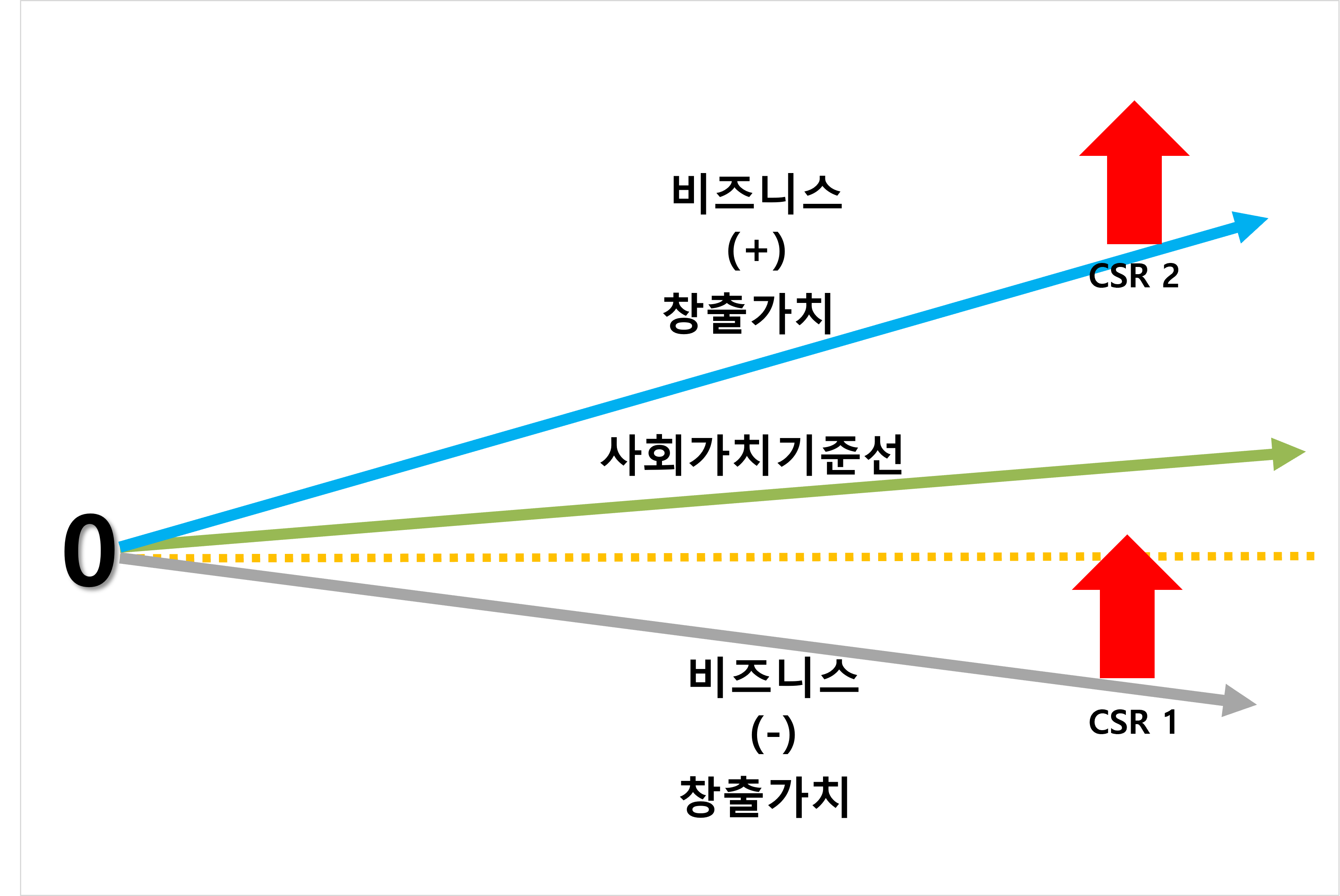 사회가치기준선 위에 존재하는 선이 ‘비즈니스 플러스(+) 가치 창출선’이다. 기업은 사회가치기준선 보다 조금이라도 높은 가치를 창출해야 이윤을 얻을 수 있다는 뜻이다. 예를 들어 생수회사는 공공재로 제공되는 수돗물(사회가치기준선에 해당) 보다는 깨끗하고 좋은 물을 판매해야 고객이 대가를 지불하고 구매한다는 것이다.