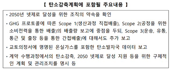 탄소배출 감축을 위한 조달지침은 연간 500만 파운드 이상의 계약건에 대한 입찰기업은 ‘탄소감축계획’을 제출하고 중앙정부기관들은 이를 조달 평가에 반영해야 한다는 것이다. 탄소감축계획은 넷제로를 위한 기업의 기본적인 노력과 계약수행 동안 환경 관리조치들을 포함하며 구체적인 내용은 아래와 같다.