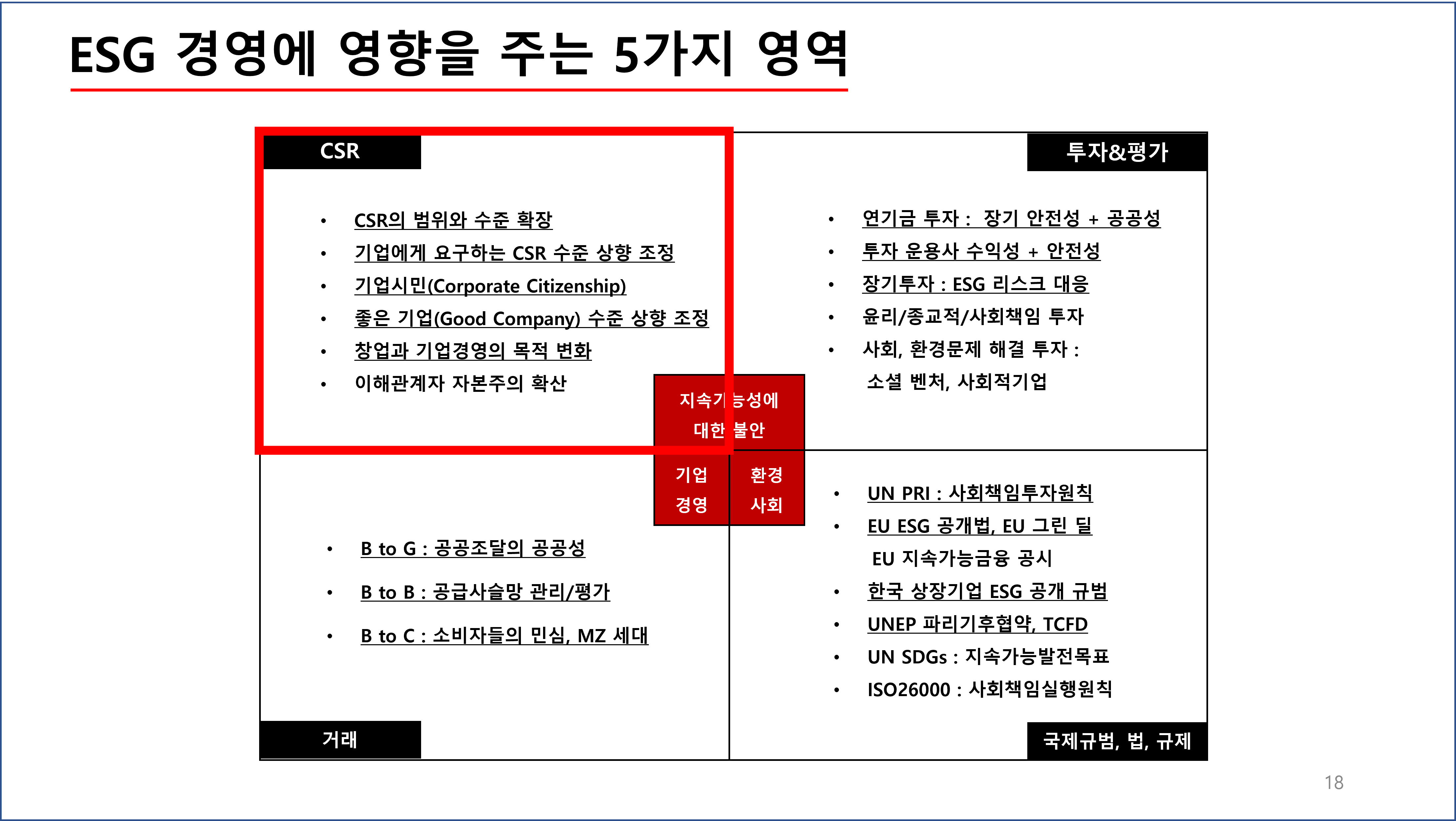 이렇듯 CSR의 범위와 수준 확장은 ESG 확산에도 매우 중요한 영향을 미치고 있을 뿐만 아니라 CSR과 ESG는 뗄레야 뗄 수 없는 관계에 있다.