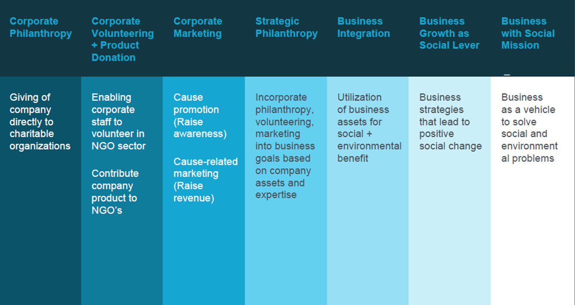 1단계 기업공익활동은 산업혁명때부터 현재까지 이어지고 있으며, 2단계 임직원봉사활동은 1, 2차 세계대전때에 미국과 영국의 기업들에서 시작되어 1990년대 전세계로 확산되었다. 3단계 공익연계마케팅 또한 1,2차 세계대전때 시작되어 1990년대 이후 TV와 신문 등 상업광고를 통해 빠르게 전세계 기업들로 퍼졌다. 4단계인 전략적 공익활동도 1990년대 시작되었다고 할 수 있다.
