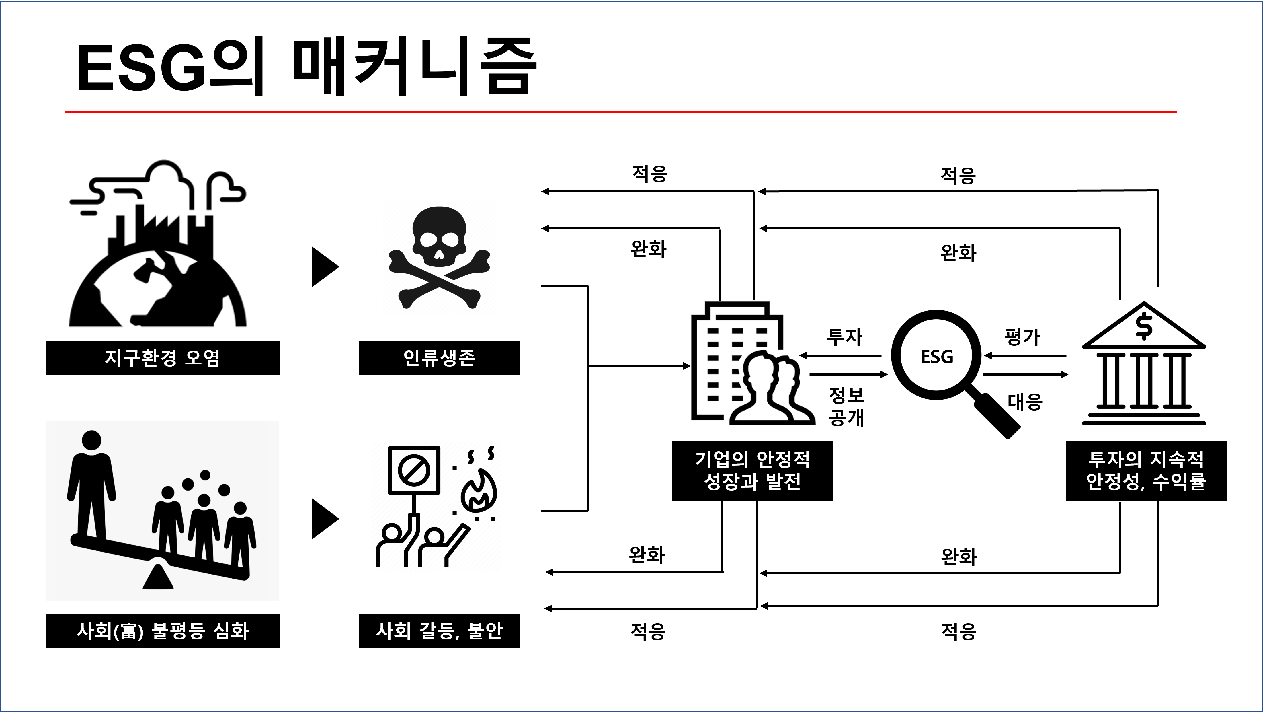 ESG는 환경오염과 사회 불평등 문제가 점점 더 심각해 짐에 따라 인류 생존과 안정적인 사회(시장)의 지속가능성을 확신할 수 없기 때문에 등장했다. ESG는 금융, 투자기관이 인류와 사회의 지속가능성을 담보할 수 없는 불안정한 상황에서도 지속 성장이 가능한 기업을 찾아내 투자하고 수익을 얻기 위해 만든 프레임이다.