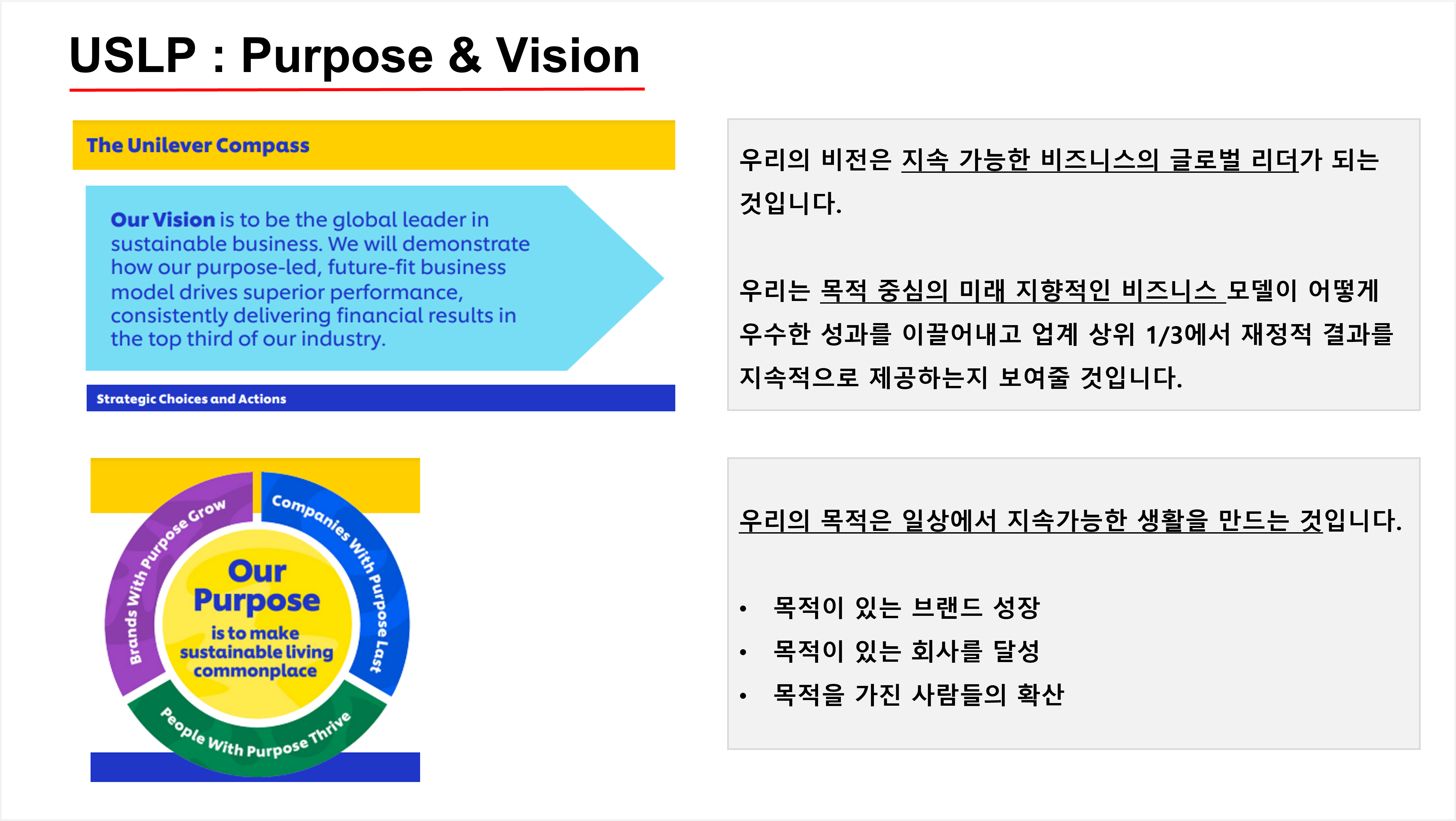 유니레버는 지속가능경영의 <목적>을 “우리의 목적은 일상에서 지속가능한 생활을 만드는 것입니다”로 정하고, 이를 구체화한 하위 개념으로 1. 목적 있는 브랜드 성장, 2. 목적 있는 회사 달성, 3. 목적을 가진 사람들의 확산을 제시하고 있다. <비전>은 “우리의 비전은 지속가능한 비즈니스의 글로벌 리더가 되는 것입니다.”로 제시하고 있다.