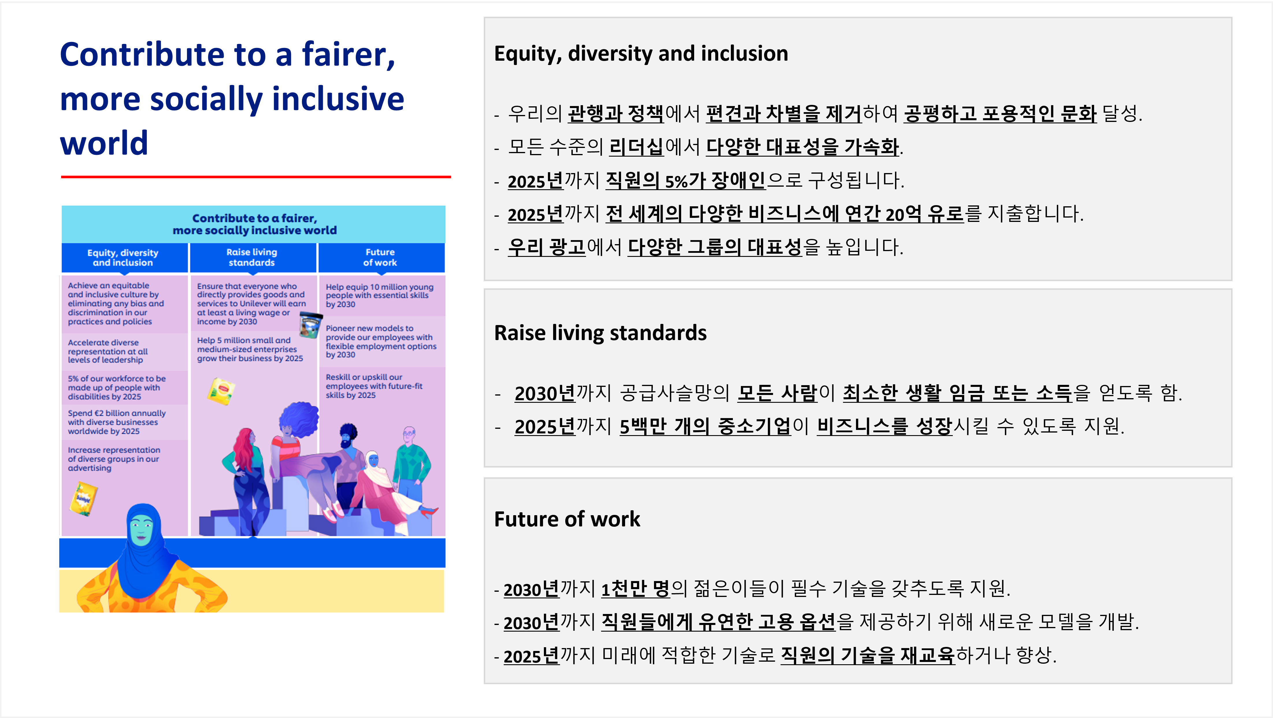 USLP 사회영역의 3대 실행과제 영역은 <공평성/다양성/포용성>, <생활 수준의 향상>, <미래의 일>이다. <공평성/다양상/포용성>은 유니레버 자체의 기업문화 뿐만 아니라 이해관계자와의 관계에서 DEI의 가치를 실현하겠다는 것이며, <생활 수준의 향상>은 제3세계 공급사슬망의 농장과 협력업체의 노동자들의 임금을 생활임금으로 올리는 등 빈부격차로 인한 사회적 불평등 문제를 개선하는데 일조하겠다는 것이다. 또한 동시에 제3세계 경제발전을 통해 유니레버의 제3세계 시장 확대를 이루겠다는 비즈니스 전략도 포함되어 있다. <미래의 일>은 기업에게 주어진 가장 기본적인 사회적 책임인 일자리 창출과 고용유지에 대한 것으로 청소년과 청년에 대한 기술교육, 직원들의 근무조건 유연화, 기술변화에 따른 직원 재교육 등의 내용을 포함하고 있다.