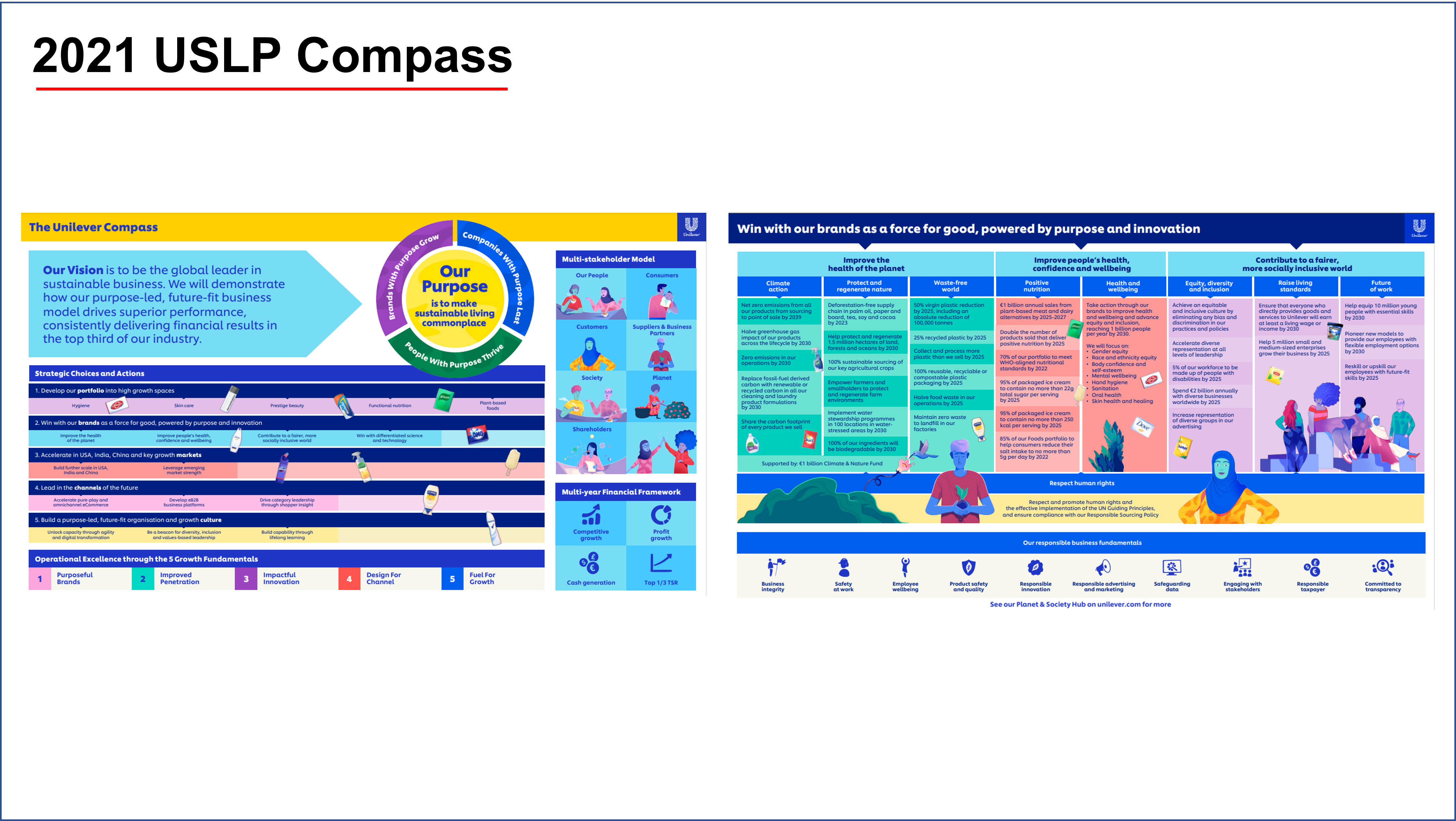 2021년에 발표한 <USLP Compass>의 구조를 보면 <목적>, <비전>, <전략적 선택과 실천활동>, <이해관계자 모델>, <2030 3대 영역별 실행과제>, <우선 가치>, <운영방식>으로 구성되어 있다. 하나씩 간단하게 살펴보자.