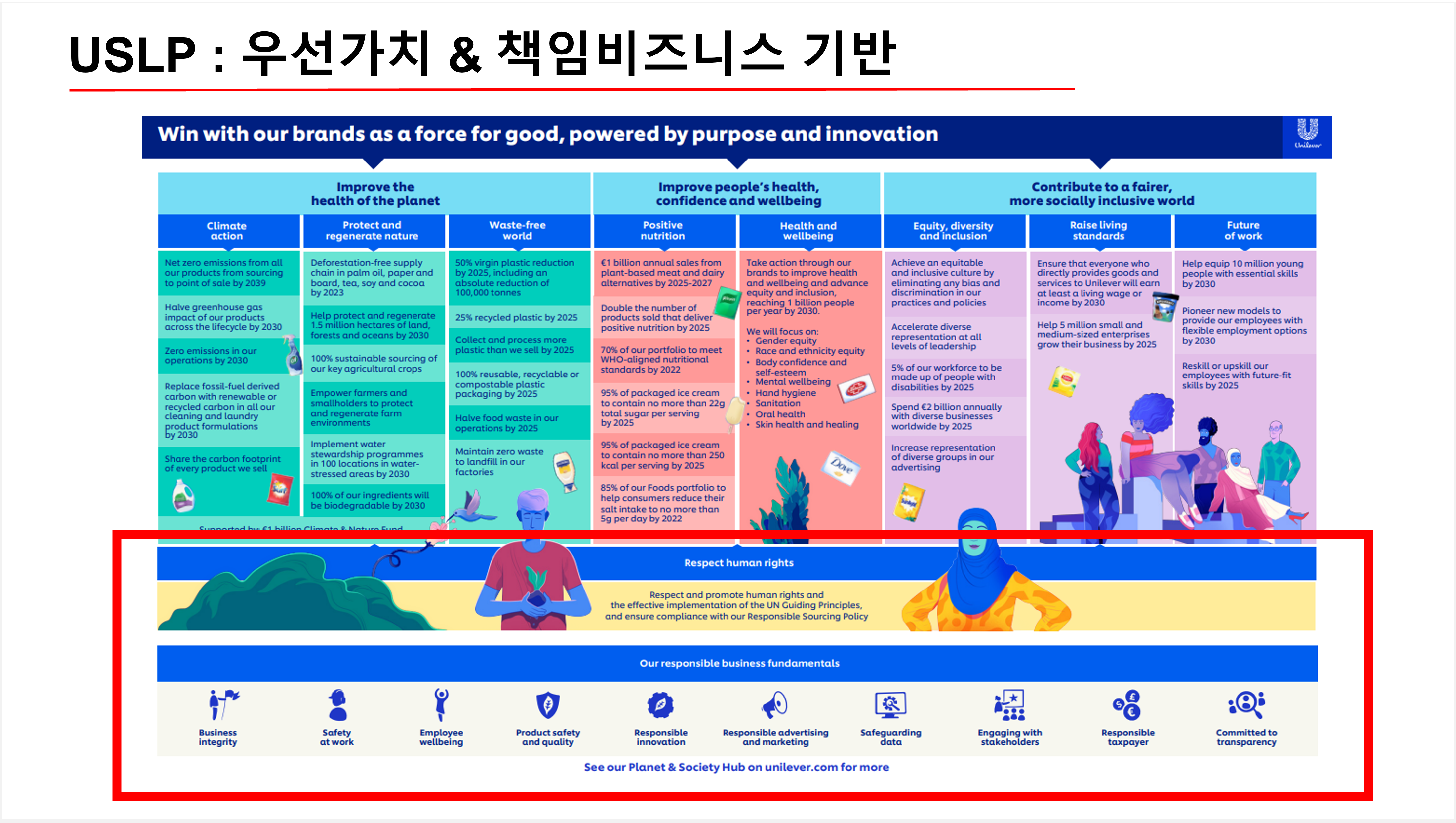유니레버가 지난 11년 동안 지속가능경영을 가장 잘하는 회사로 인정받고 있는 이유는 여러 가지가 있겠지만 전문가들이 공통적으로 언급하는 것이 바로 USLP(Unilever Sustainable Living Plan)의 훌륭한 체계와 완성도이다. USLP는 2010년 당시 유니레버의 CEO였던 폴 폴먼(Paul Polman, 2009-2018 재임)이 제시한 유니레버의 지속가능경영 전략체계이다.