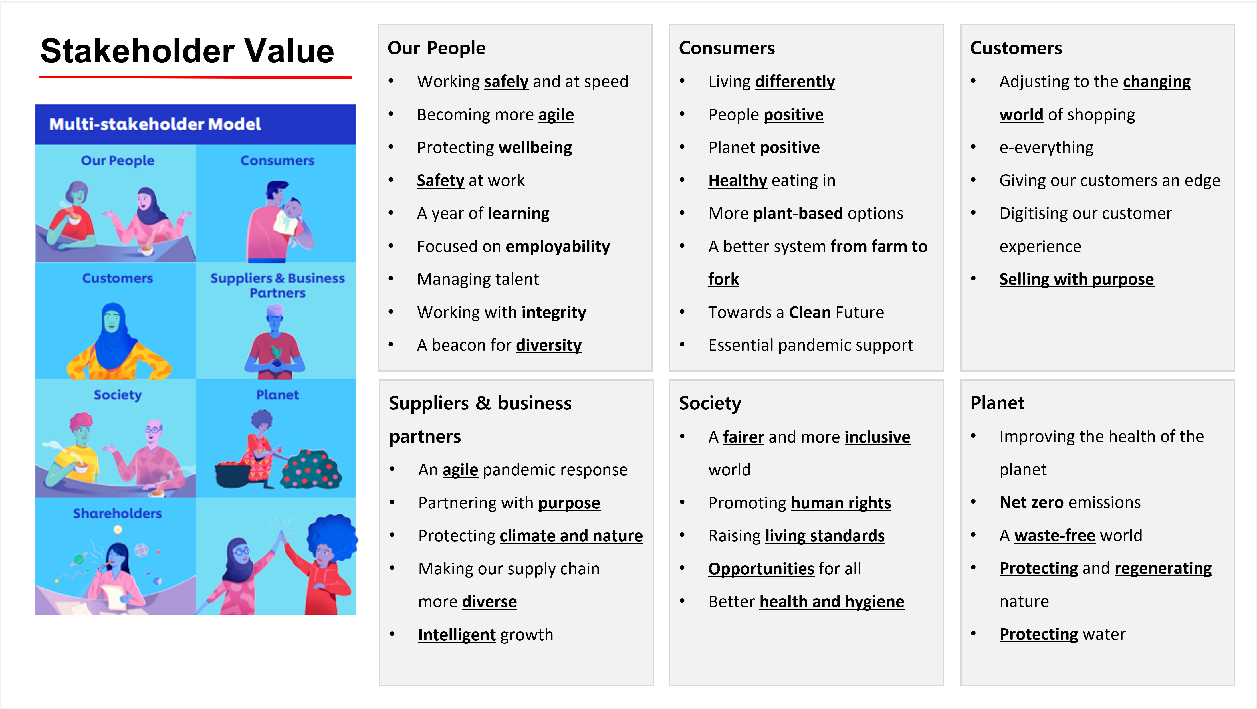 앞선 여러 글에서 설명한 바와 같이 지속가능경영은 ‘기업의 비즈니스 가치사슬 전체의 모든 이해관계자들과의 관계에서 발생하는 사회, 환경적 이슈를 잘 관리(부정적 영향은 최대한 줄이고 긍정적 영향은 최대한 확대하는)하는 것’ 이라 정의할 수 있다. 그런면에서 지속가능경영전략체계를 수립할 때 우리회사의 이해관계자를 정의하고 이해관계자별 추구 가치를 제시하는 것이 당연히 필요한 절차이다. USLP는 지속가능경영의 정의에 따라 이해관계자 모델을 전략체계내에 중요한 위치에 자리잡게 하고 각각의 이해관계자별로 달성해야 할 가치를 제시하고 있다.