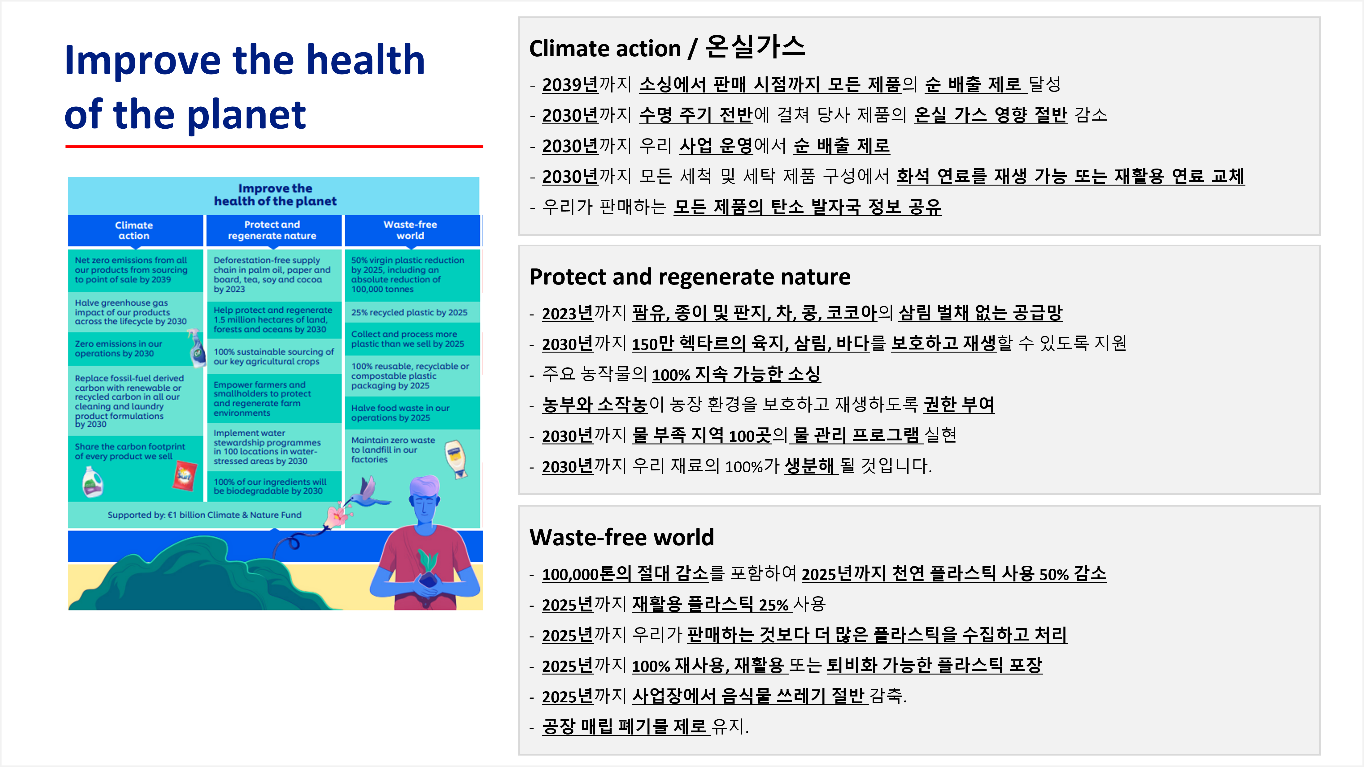 USLP의 환경영역목표는 <기후행동(온실가스)>, <자연 보호 및 재생(생태계 보호)>, <쓰레기 없는 세상(폐기물 관리)> 등 3가지 실행과제 영역으로 구성되어 있다. 또한 각각의 영역에는 '구체적인 목표가 제시'되어 있는데, 이 부분이 우리나라 기업들이 적극적으로 벤치마킹 해야 할 부분이다.
