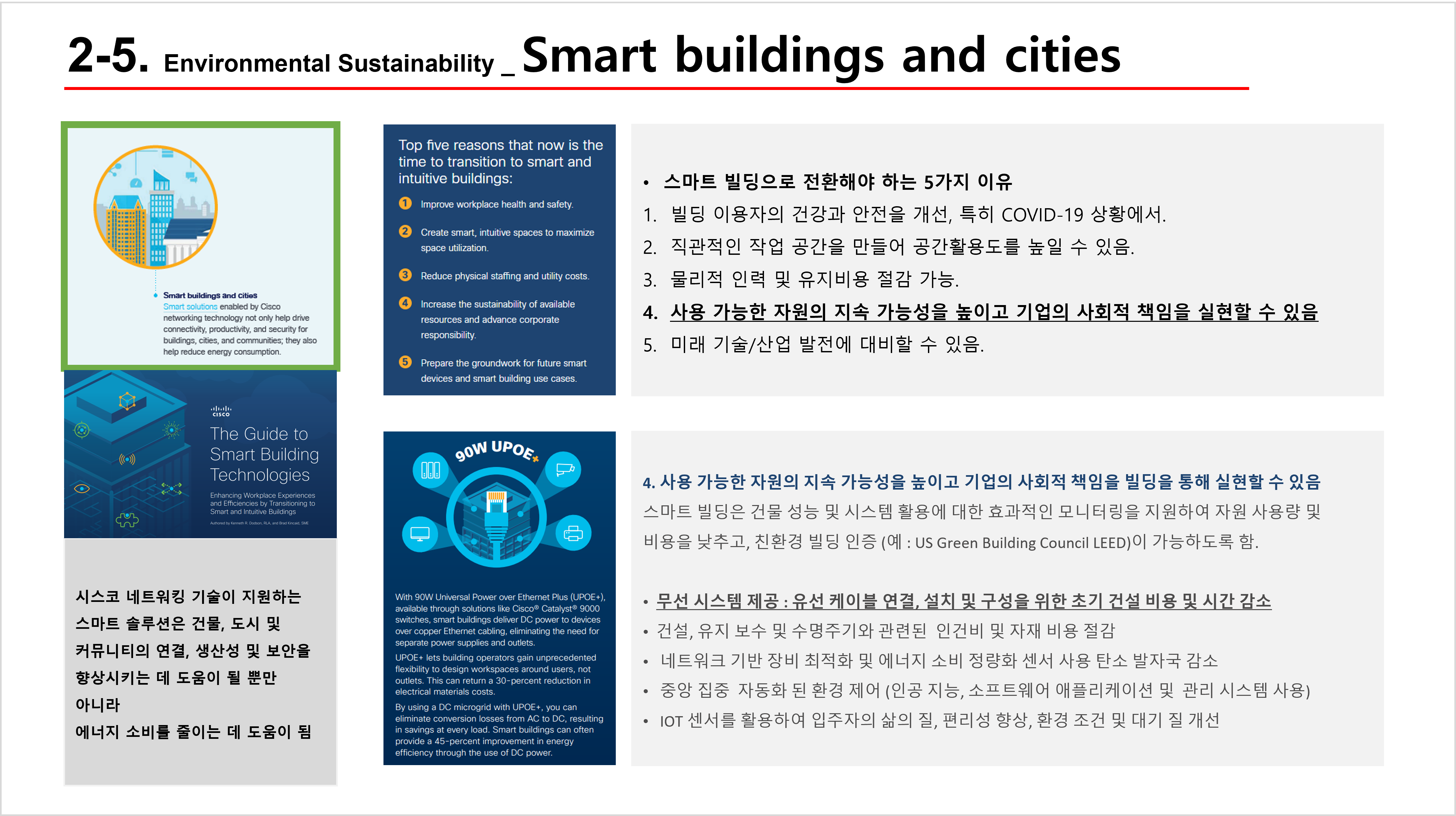 또한, CICSO는 지속가능경영과 비즈니스의 결합을 잘하고 있다. 시스코는 무선 네트워킹과 IOT, AI 기술을 결합한 <스마트 빌딩과 도시 솔루션>을 통해 빌딩과 도시의 에너지 효율성, 보안성, 안전성을 높이는 제품과 서비스를 제공하고 있다. 환경부담, 안전부담, 비용부담을 낮추기 원하는 더 많은 기업과 정부/지자체들이 시스코의 스마트 솔루션을 선택하고 있다.