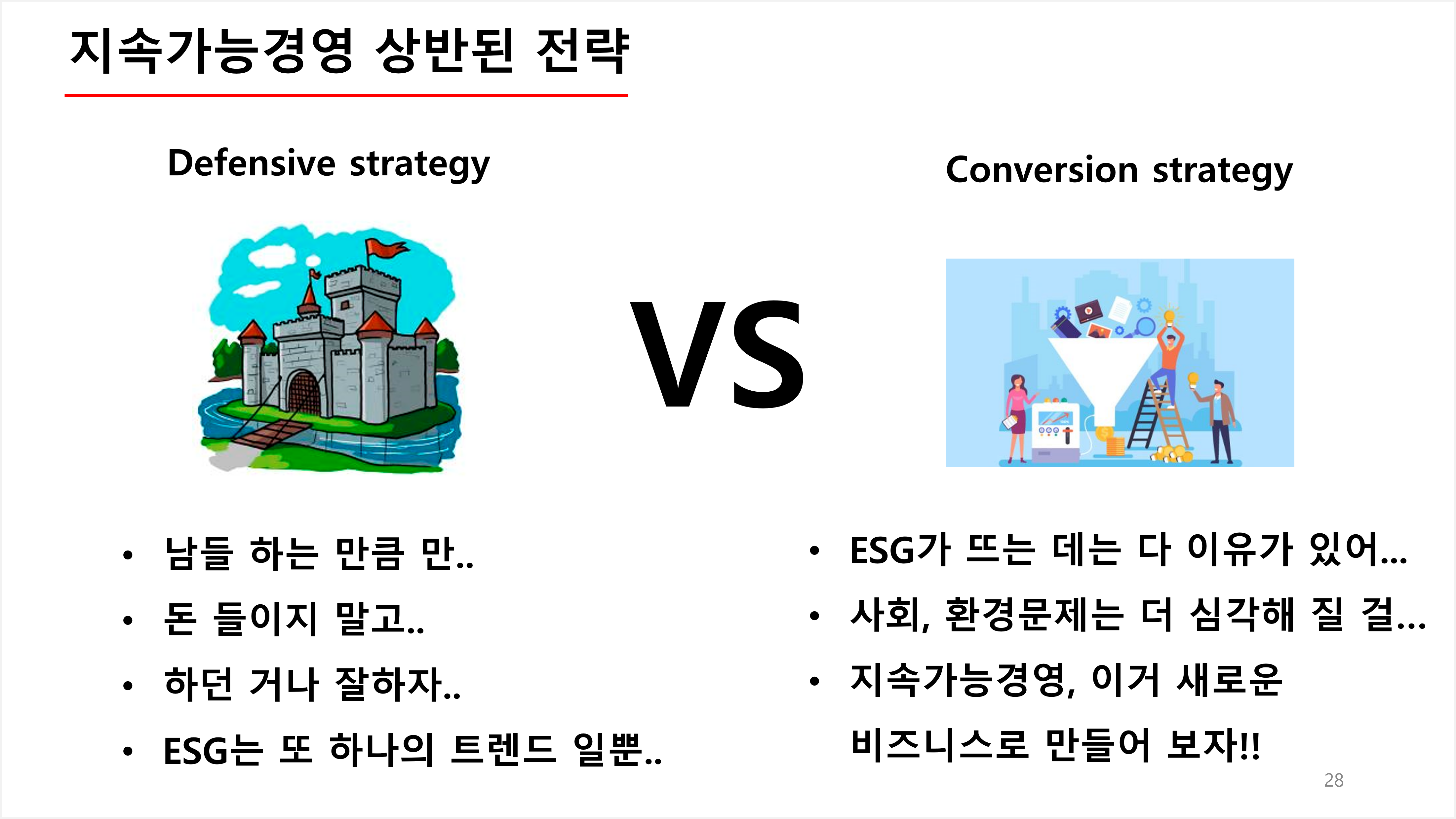 두번째 전략은 'ESG가 뜨는 데는 다 이유가 있어.. 사회, 환경문제는 더 심각해지기 때문에 이 두 영역을 제대로 비즈니스화 하지 않으면 앞으로 힘들거야.. 때문에 지속가능경영, 이거 새로운 비즈니스로 만들어보자.. ' 라는 적극적 대응 전략이 있다.