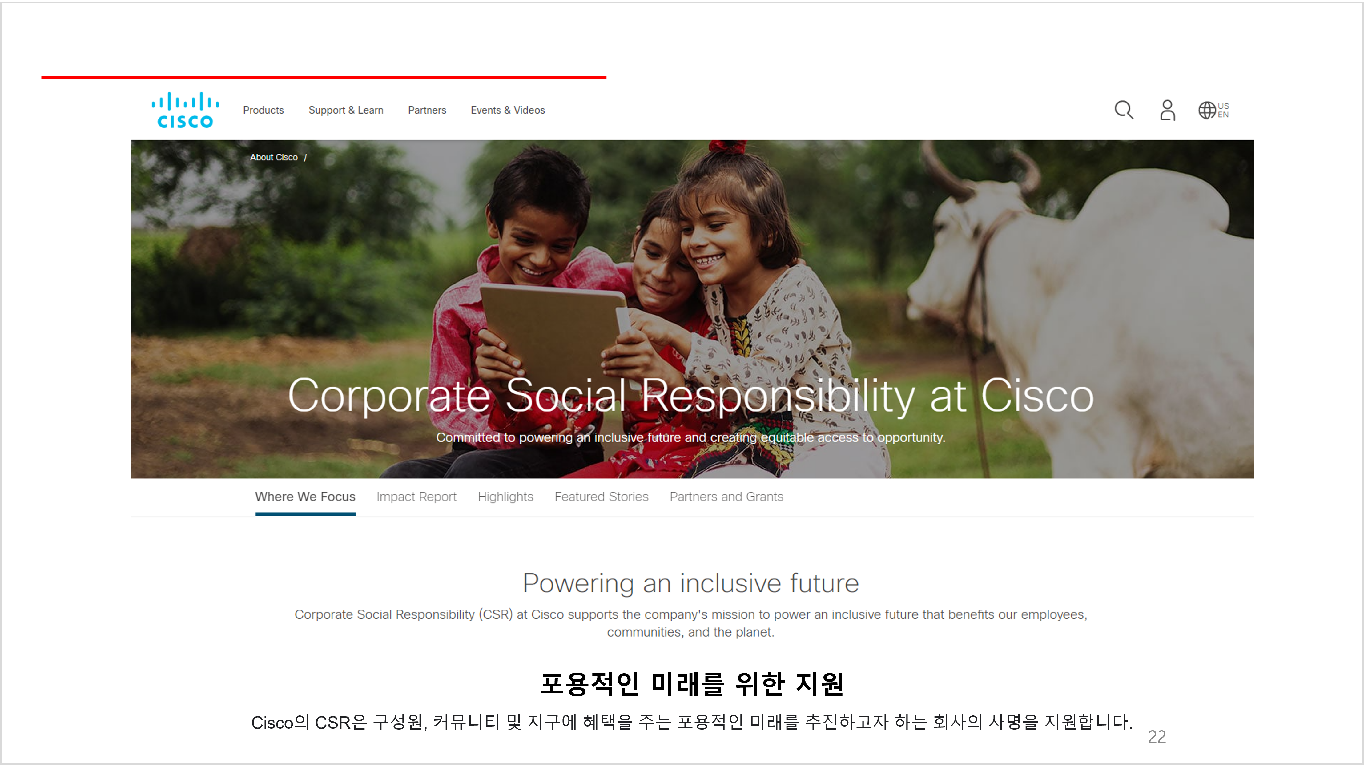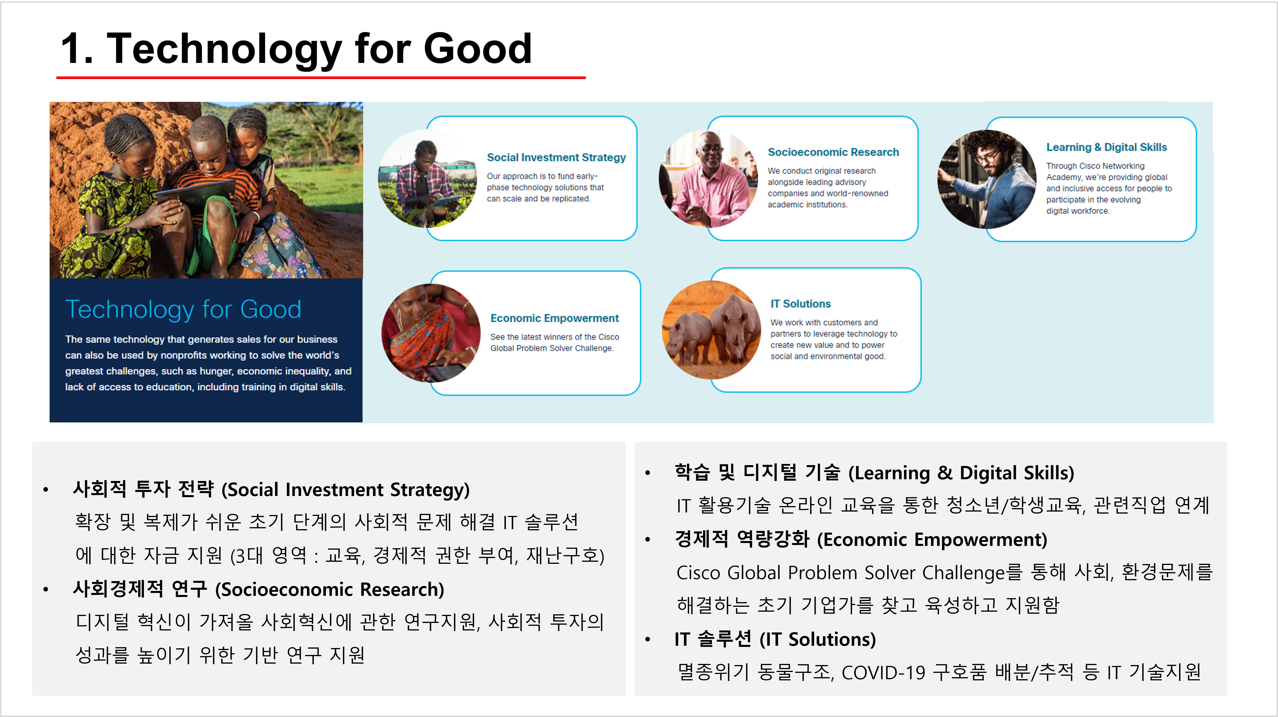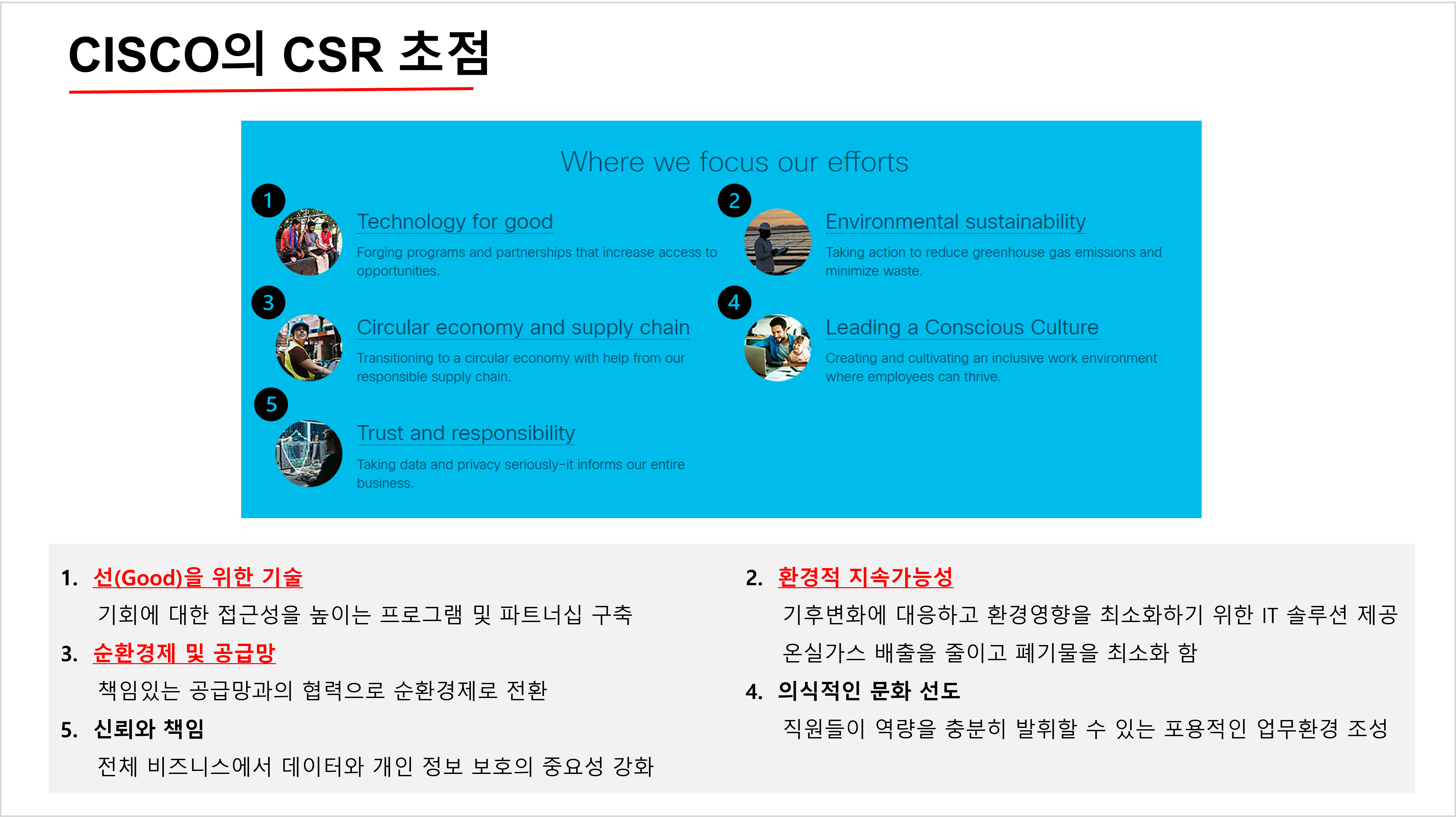 코로나 시기에 Zoom과 양대산맥을 이뤘던 바로 그 Webex 서비스를 제공하는 CISCO는 잘 알다시피 인터넷 통신 인프라 및 관련 서비스를 제공하는 미국 IT회사이다. CISCO는 지속가능경영, ESG를 CSR 영역안에 포함하고 있다.