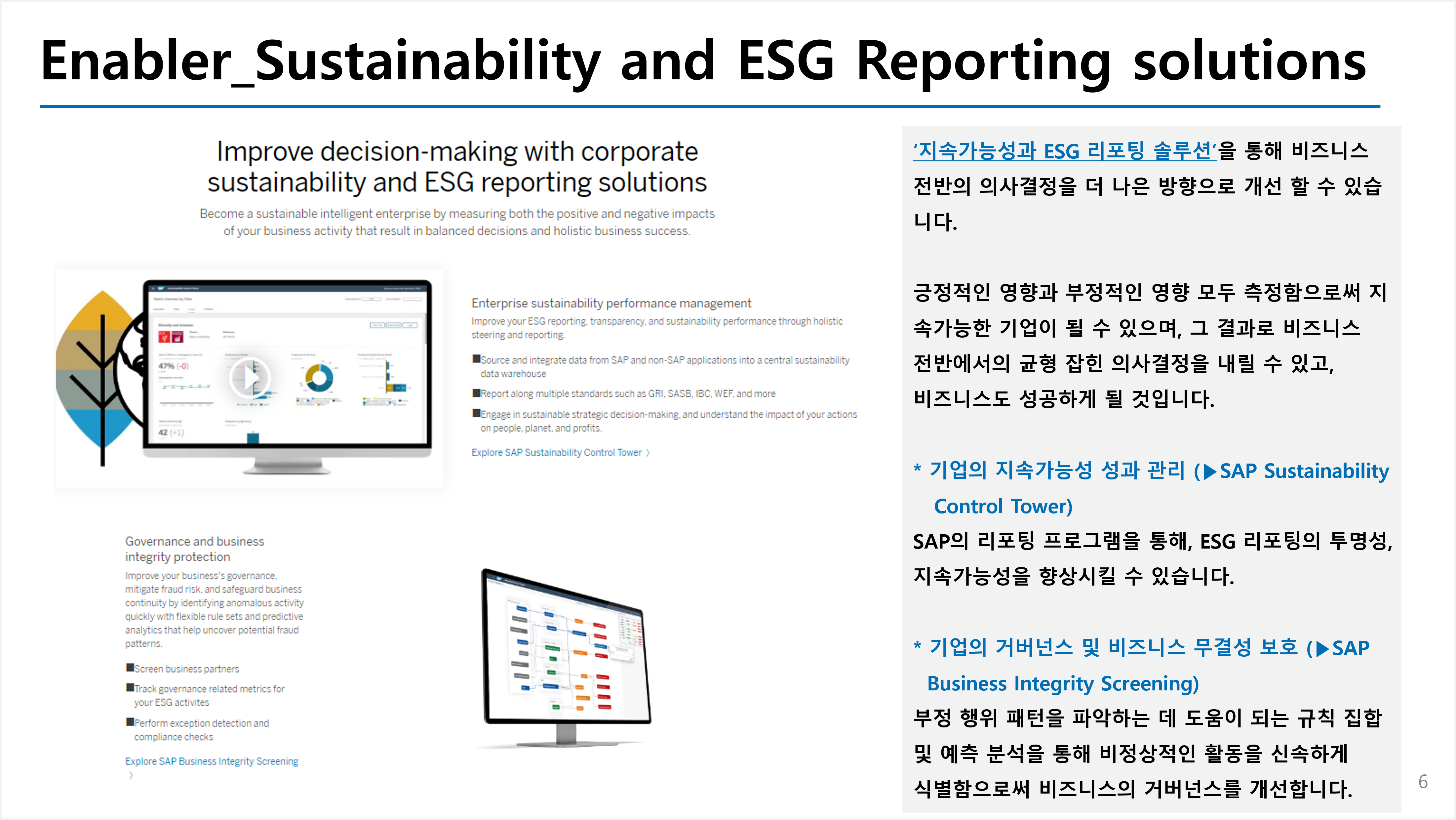 <지속가능 & ESG 리포팅 솔루션>은 ERP 데이터와 연동해 기업 비즈니스 가치사슬 상의 긍정적인 영향과 부정적인 영향을 신속하게 측정하고 이를 분석하여 올바른 의사결정을 할 수 있도록 지원하며, 이해관계자들이 이해하고 납득할 수 있는 수준의 지속가능성 성과를 투명하고 정확하게 보고할 수 있는 기능을 제공하고 있다.