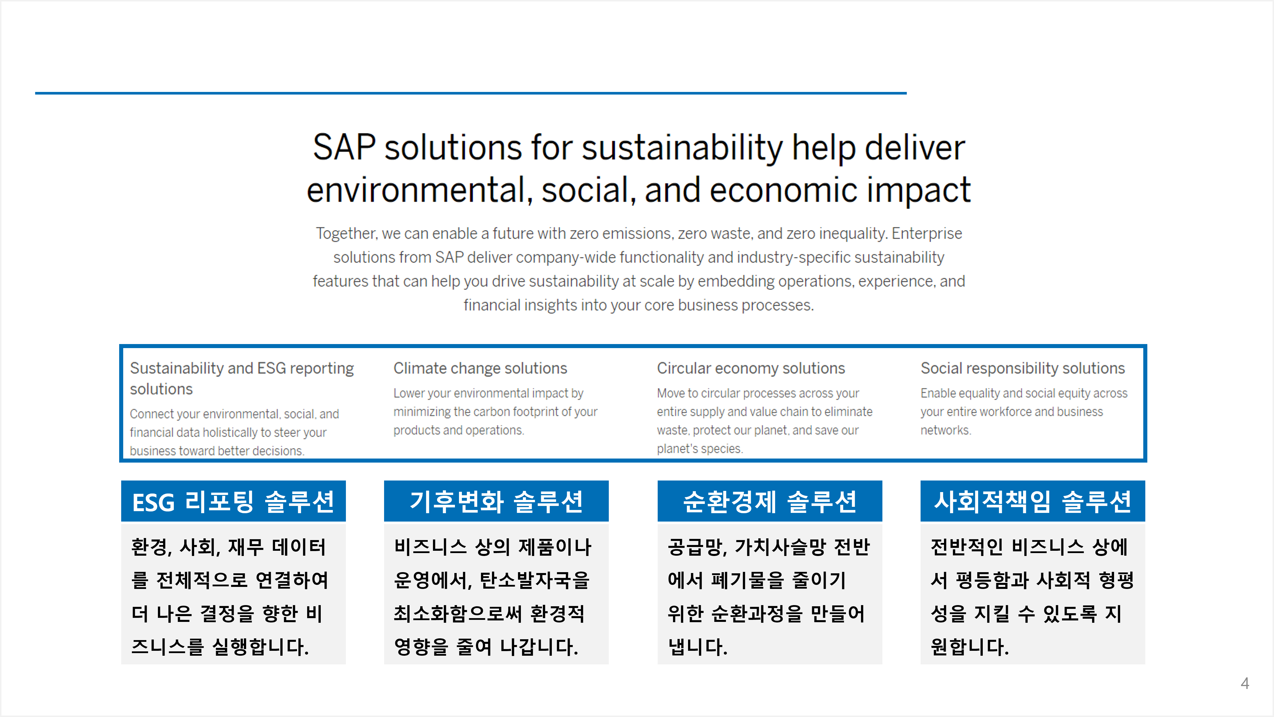 무엇보다, 기업들이 지속가능경영을 실행함에 있어 필수적으로 필요한 1) 리포팅 솔루션, 2)기후변화 솔루션, 3)순환경제 솔루션, 4)사회책임 솔루션 등을 기존의 ERP 시스템과 결합하여 제공하고 있다.
