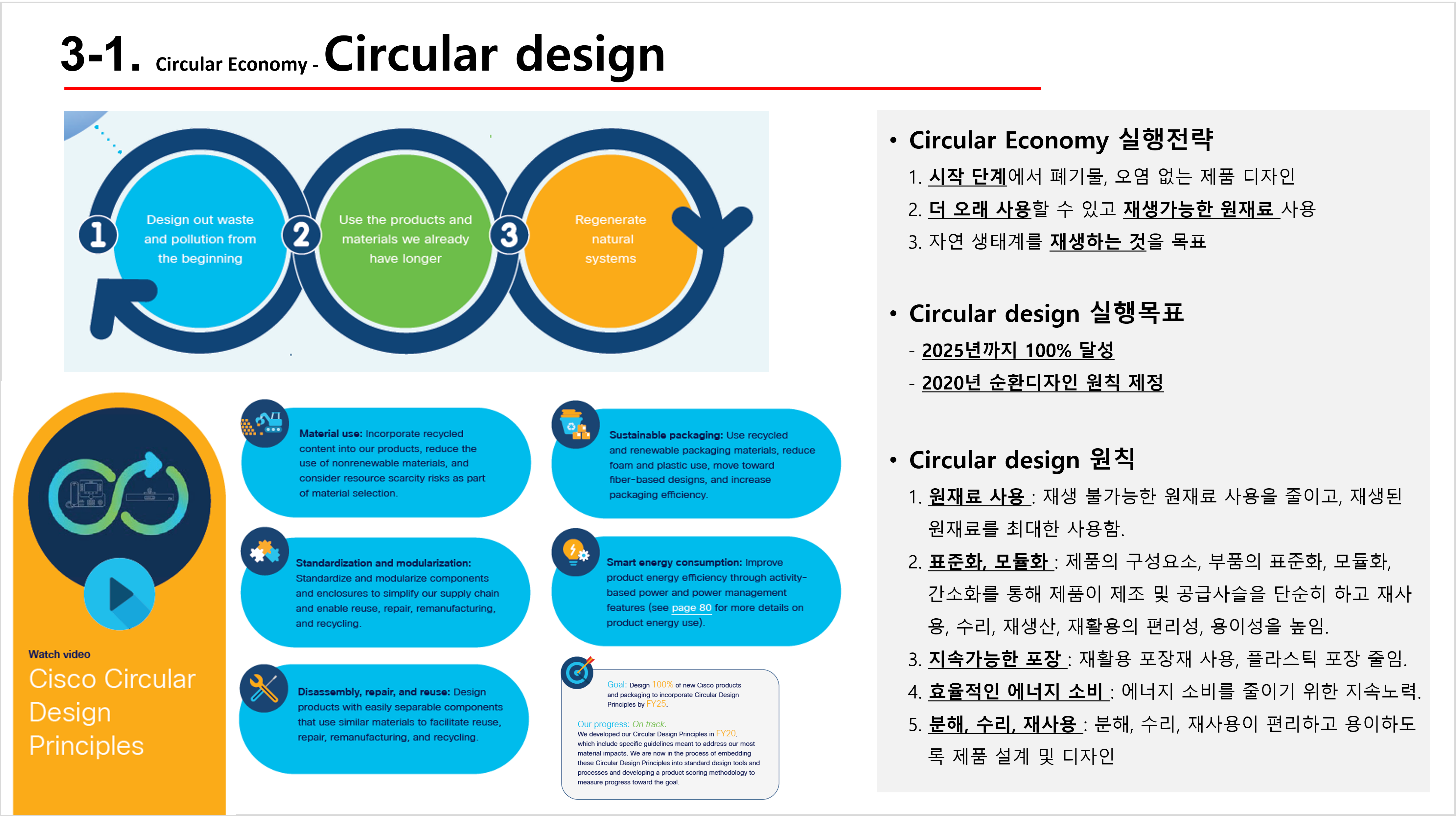 특히, 이 중에서도 세번째 전략과제인 <순환 디자인 및 소비> 부분은 우리나라 기업들이 벤치마킹할 포인트가 꽤 많다. 디자인 단계에서부터 사용후 폐기 및 재활용 단계까지 (1)순환 디자인, (2)순환 솔루션, (3)순환 소비, (4)순환 운영, (5)생태계 리더십 등 제품과 서비스의 라이프 사이클에 따라 시스코가 어떻게 행동해야하는지에 대해 <순환 디자인 원칙>을 제시하고 이를 실행하게 위한 구체적인 전략과 방법 및 프로젝트와 프로그램을 제시하고 있다.