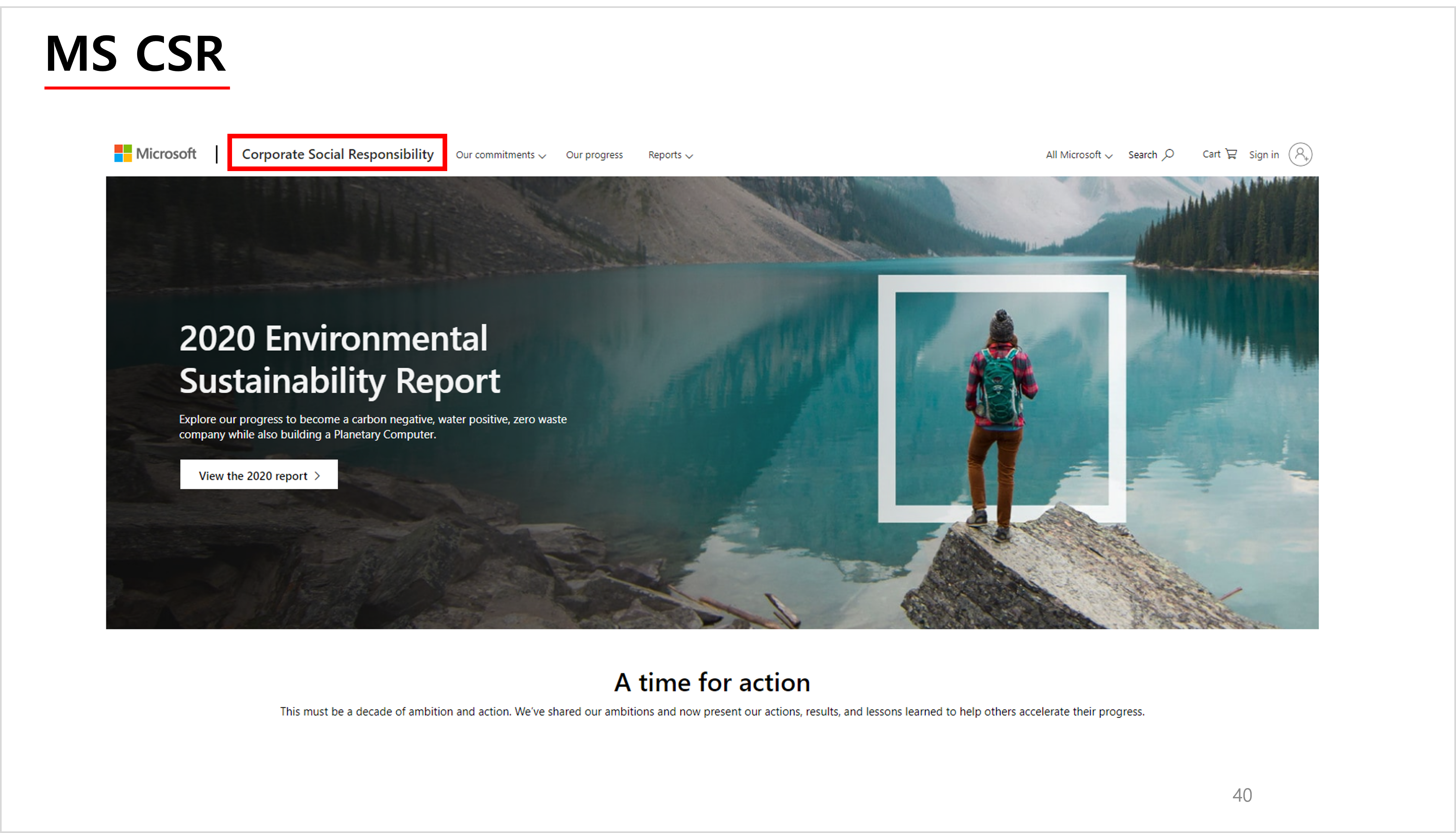 마이크로소프트 역시 CSR을 지속가능경영과 ESG를 아우르는 용어로 사용하고 있다. MS의 보고서들을 보면 ESG는 '투자' 영역에서 제한적으로 사용하고 있음을 알 수 있다.
