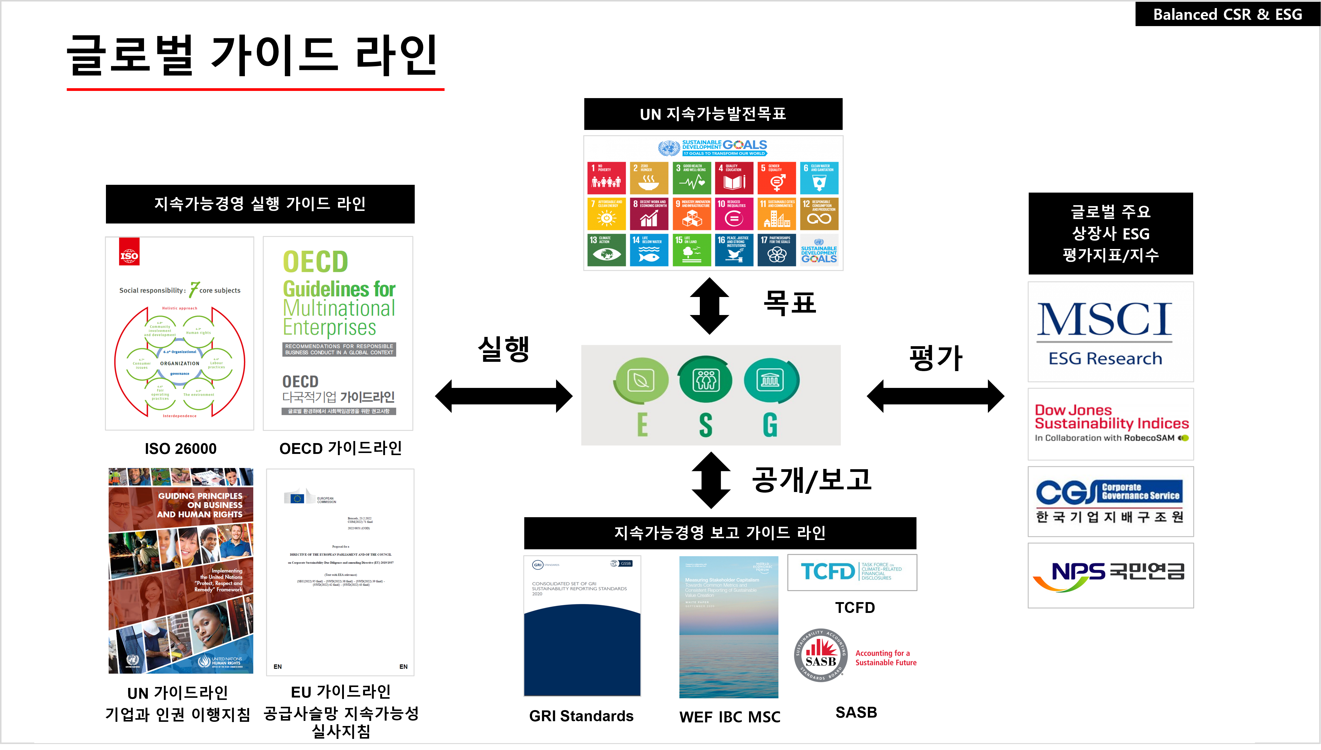 ESG 전문가가 되기 위한 학습의 출발점은 글로벌 가이드라인이다. 전문가까지는 아니고 ESG 실무자가 된다고 하더라도 글로벌 가이드 라인과 ESG 각 영역에 관련된 주요 법과 제도는 당연히 알아야 한다. 자동차 전문가가 아닌 그냥 자동차 운전만 하더라도 도로 교통법은 알아야 하는 것이 상식이다.