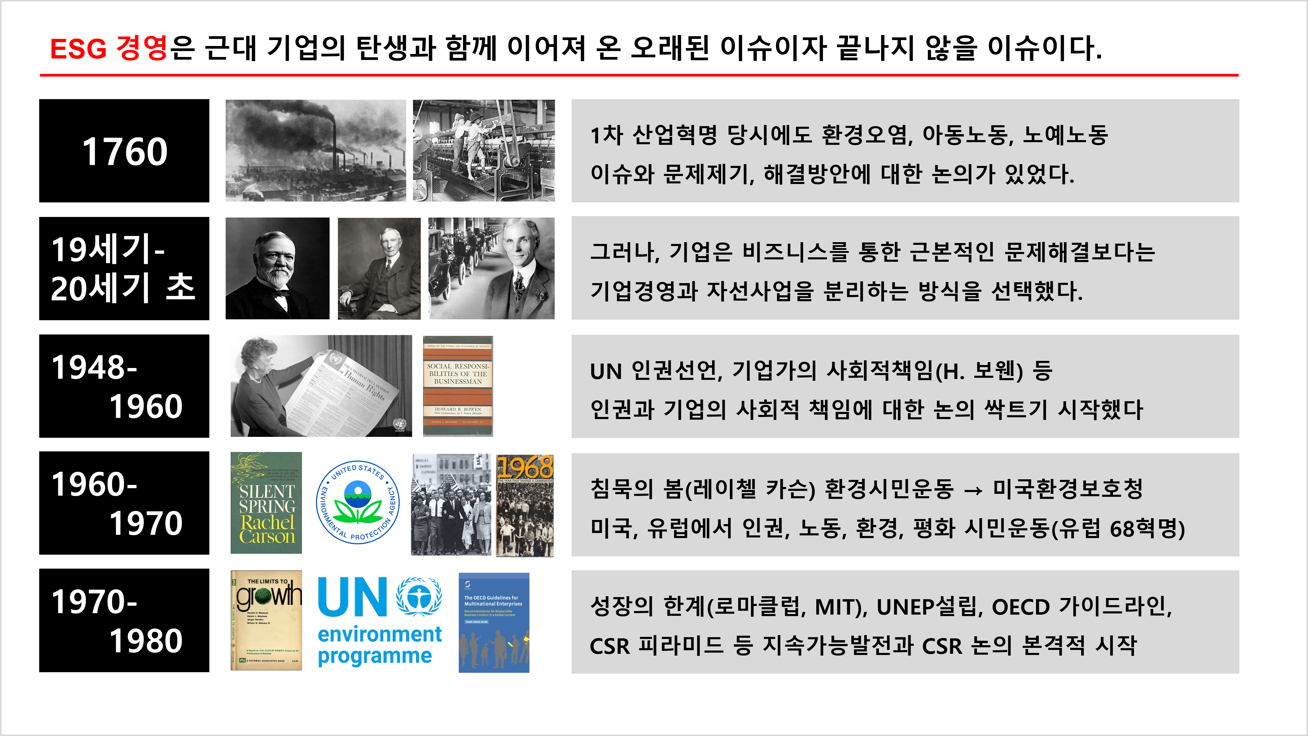기업들이 ESG를 해야만 하는 이유를 개념만 가지고 설명하거나 설득하기는 쉽지 않다. 하지만 그동안 일어났던 주요 사건과 사고들을 이어보면, 자본주의의 거대한 흐름과 기업 경영의 단계가 ESG와 지속가능경영으로 가는 것을 깨달을 수 있다. 역사적 당위성과 흐름의 방향을 알게 되면 의사결정과 실행이 선택이 아니라 당연한 일이 된다.