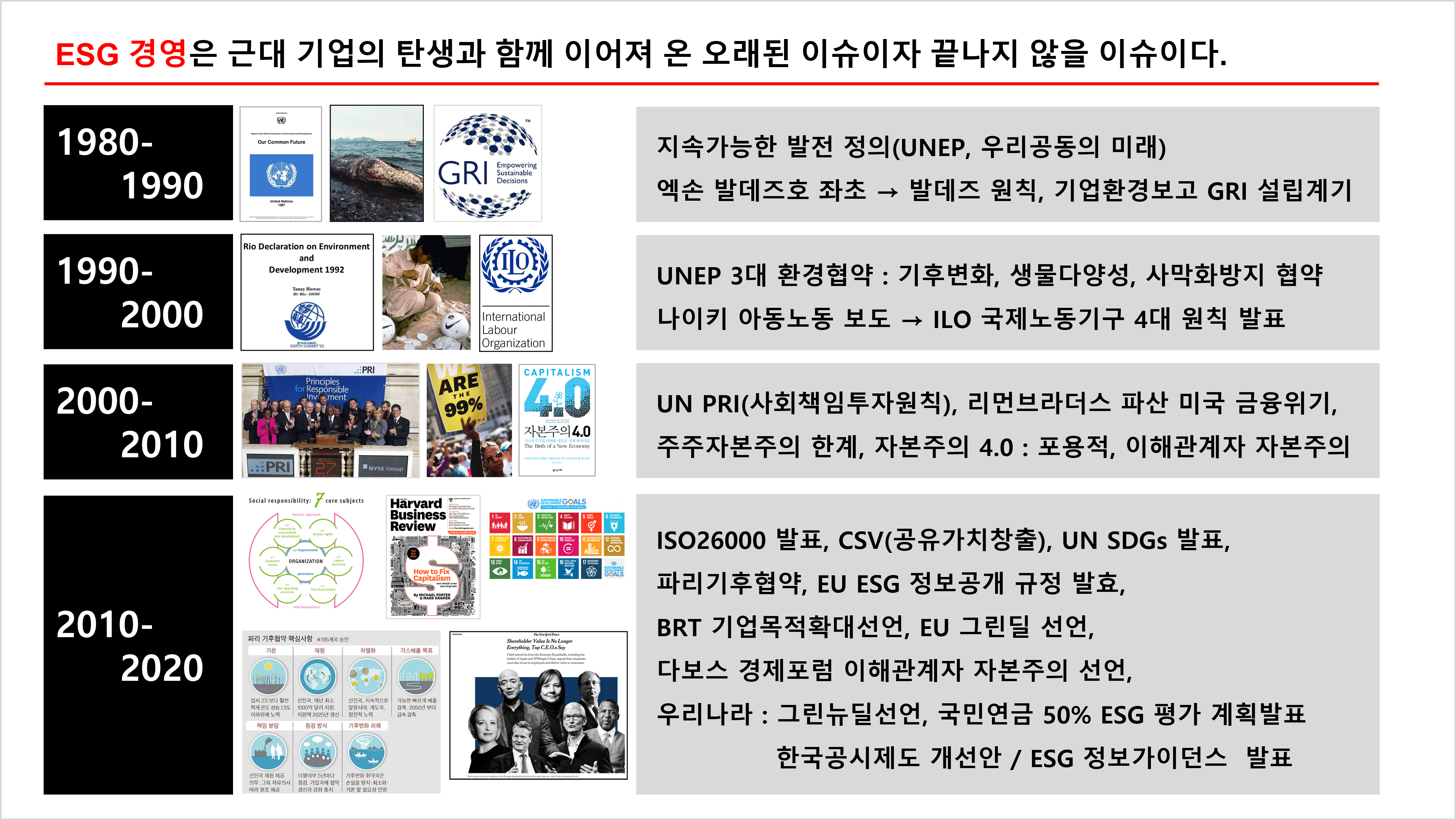 모든 공부가 그렇지만 ESG의 역사와 맥락, 그리고 주요 사건과 사고를 제대로 아는 것은 지식적인 측면에서도 중요하지만, 왜 해야하는지에 대한 당위성 측면에서도 중요하고, 기업 내부에서 의사결정을 하고 실행을 독려하기 위한 동기부여 차원에서도 중요하다.