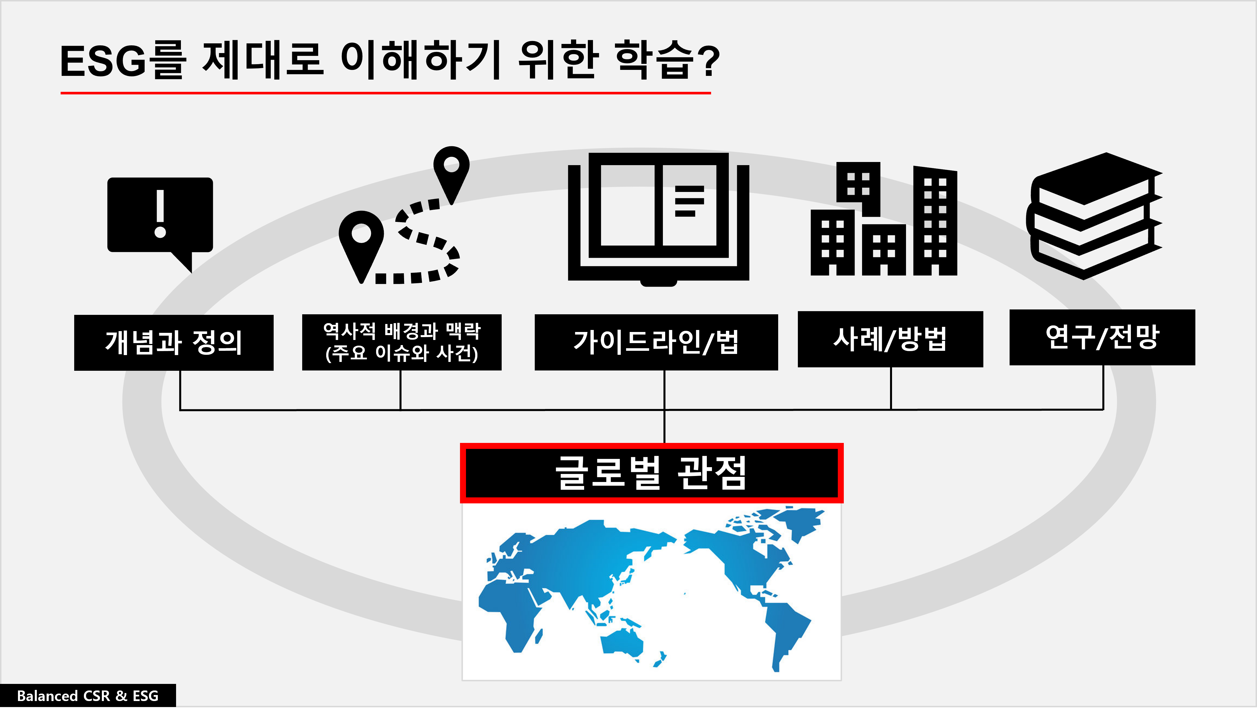 ESG 전문가가 되기 위해 공부해야 할 것 중, 중요한 부분이 '글로벌 관점'을 갖는 것이다. ESG는 글로벌 이슈이다. 우리나라 사정과 관점으로 아무리 이해하고 해결 방법을 찾으려고 해도 할 수 없는 부분들이 ESG에는 너무 많다. 지구 온난화와 온실가스, 신재생에너지만 하더라도 우리나라 방식으로 해결해서는 답이 나오지 않는다.
