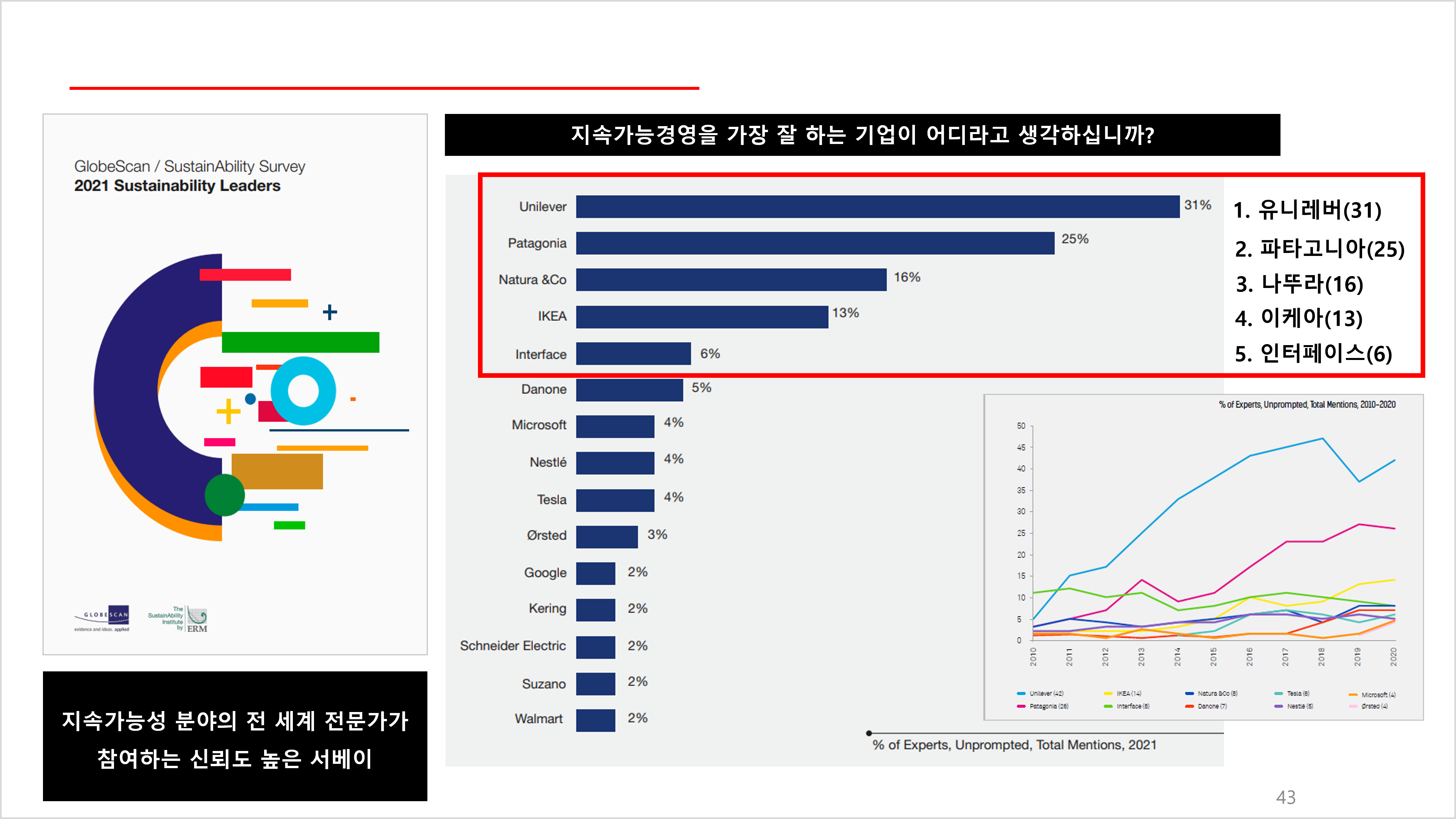 뿐만 아니라 CSR, 지속가능경영을 잘하는 대표적인 기업에 대해서는 보다 깊고 많이 알아야한다. 유니레버, 파타고니아, 바디숍(나뚜라), 인터페이스와 같은 기업의 사례를 모르고 ESG, 지속가능경영을 논한다는 것은 프리미어리그를 빼고 축구를 말하는 것과 같고, 김연아를 빼고 여자 피겨스케이팅을 논하는 것과 같다.