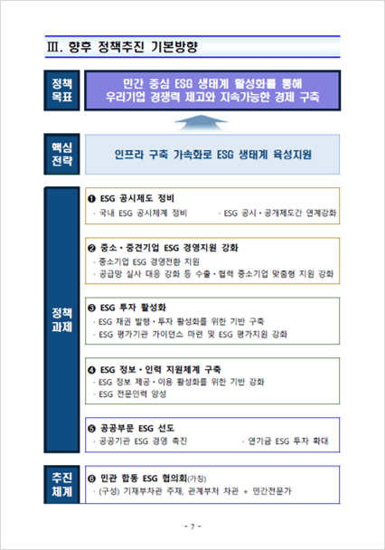 ESG를 '투자나 수출 중심'으로 대응하는 것은 당장 닥칠 현실적 이슈 때문에 그렇다고 생각하지만, 또 다른 한 편으로 투자나 수출을 넘어 우리나라 기업들이 기본적으로 갖추어야 할 지속가능경영체계를 위해서는 보다 근본적이고 장기적인 마스터 플랜이 필요하다고 본다.