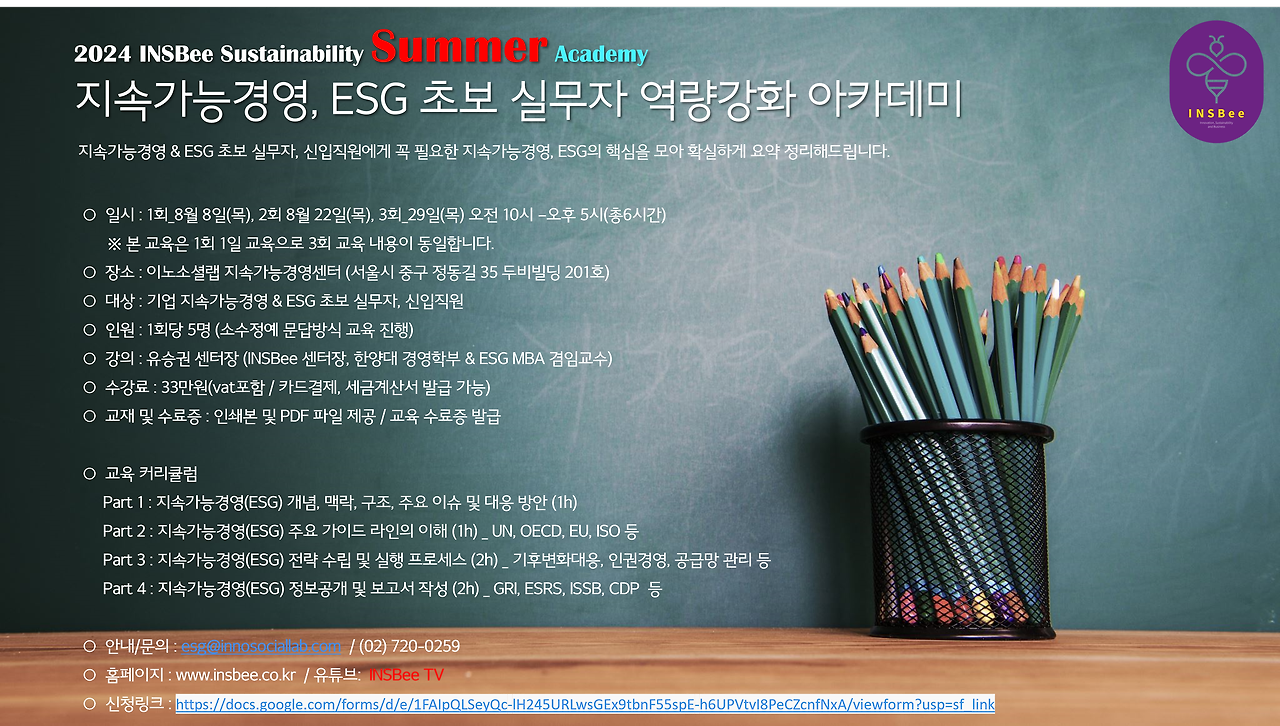 | 인스비 썸머 아카데미 _ 지속가능경영, ESG 초보자 맞춤 교육 프로그램 (0) | 2024.07.17 |